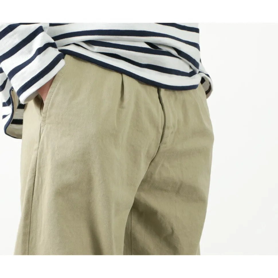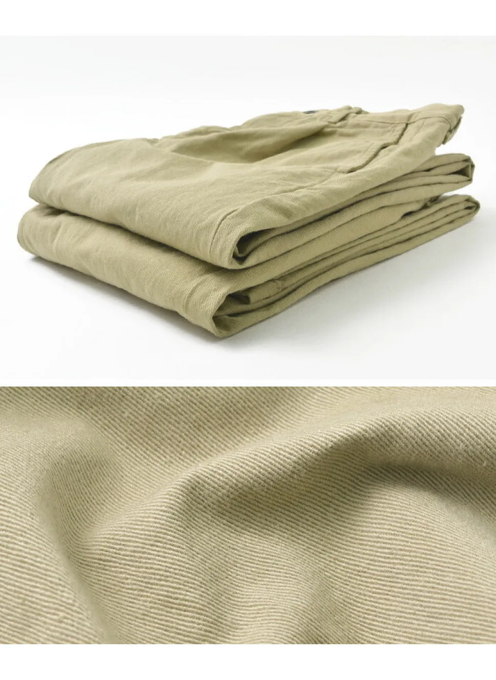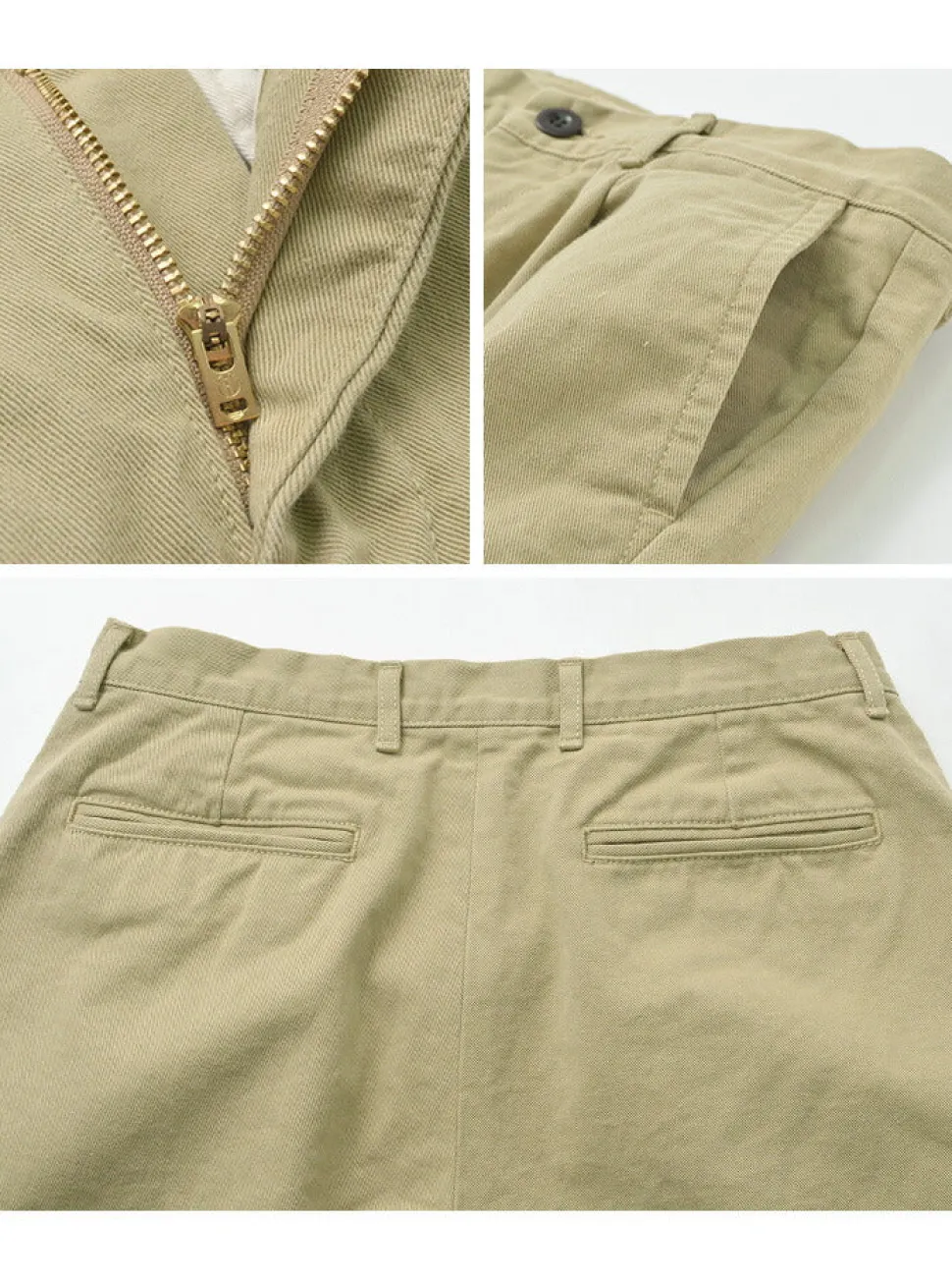 thickly woven selvedge chino has a supple and firm feel despite its stiffness. The natural unevenness of the fabric develops as the trousers are worn in.