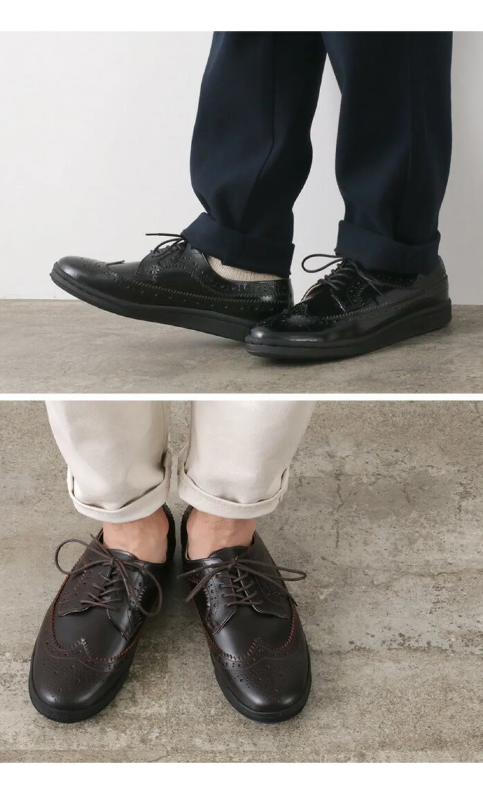 The same solid cowhide leather as our boots. Looks like a boot, feels like a boot. The sole is made of trainer sole, which makes it light and comfortable. A classic and versatile wingtip made from cowhide leather. The wingtip is a traditional English dress shoe. The wingtip has a dressy image because of the beautiful decoration on the leather, but it was originally a work shoe worn in the marshes of Ireland and Scotland.