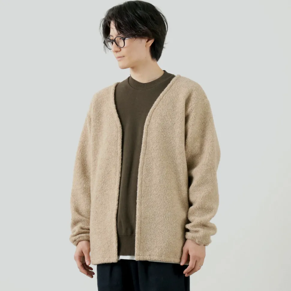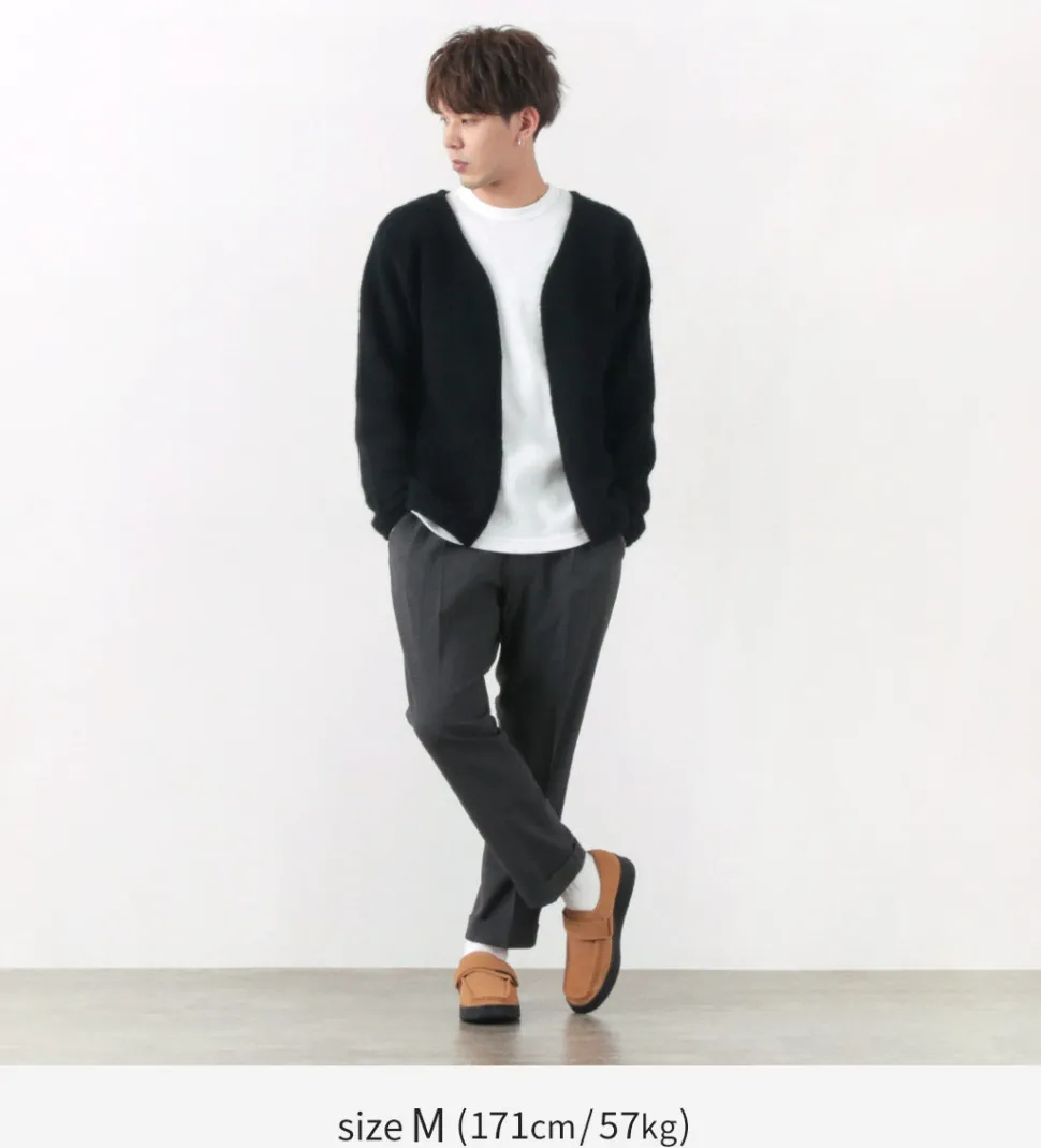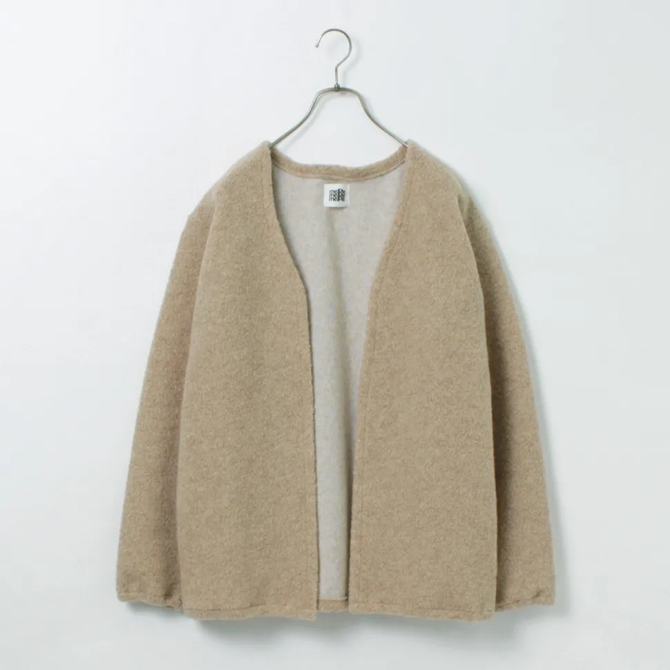 This is a piece of MELPLE’s popular bolero cardigan made into an autumn/winter version. The warm wool and angora blend fabric is used to provide a high level of heat retention. The bolero design with no buttons on the front allows for easy on and off. It is also useful for adjusting to small differences in temperature between indoors and outdoors. The minimal design makes it easy to match with other items.