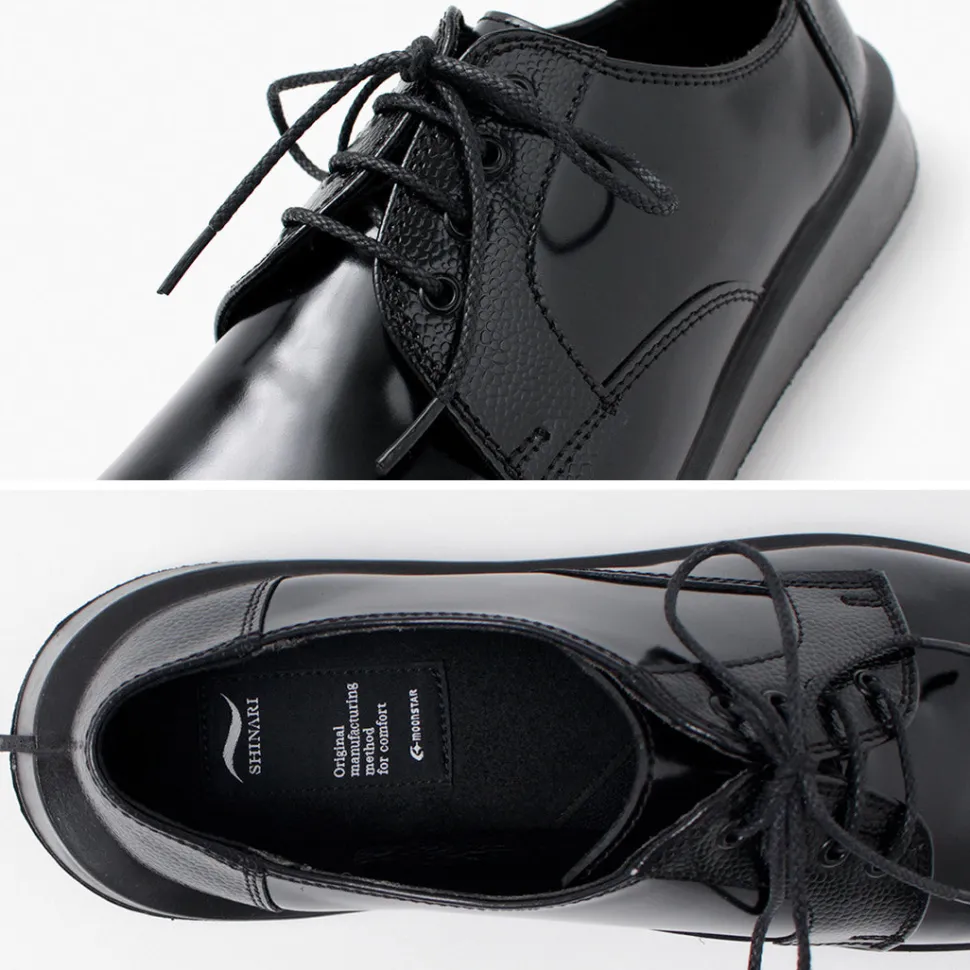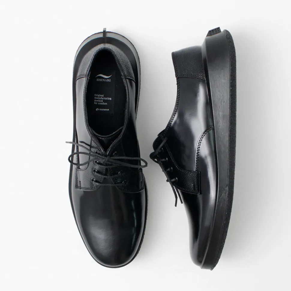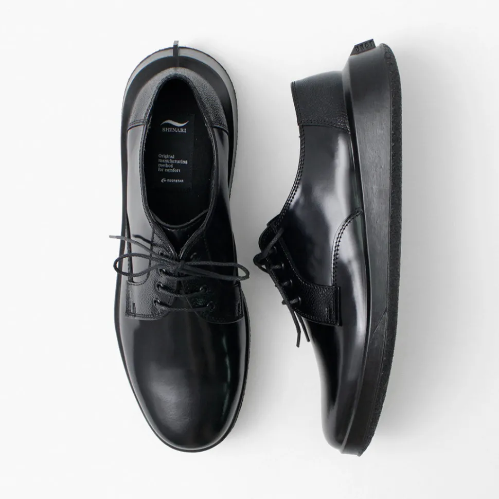 Combining elegance and cozyness“SHINARI” is a new line of shoes from MOONSTAR. This series incorporates design elements from MOONSTAR’s archives, mainly leather shoes, into a unique sole shape that creates cushioning by flexing the outsole. The simple derby-plain “SUMEN (bare surface)” is a pair that is elegant with its characteristic feather stitching and overlapping patterns, yet comfortable and easy on the feet.