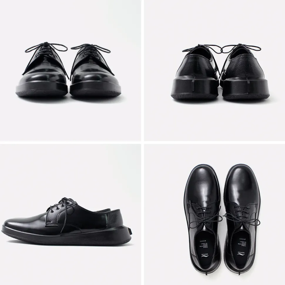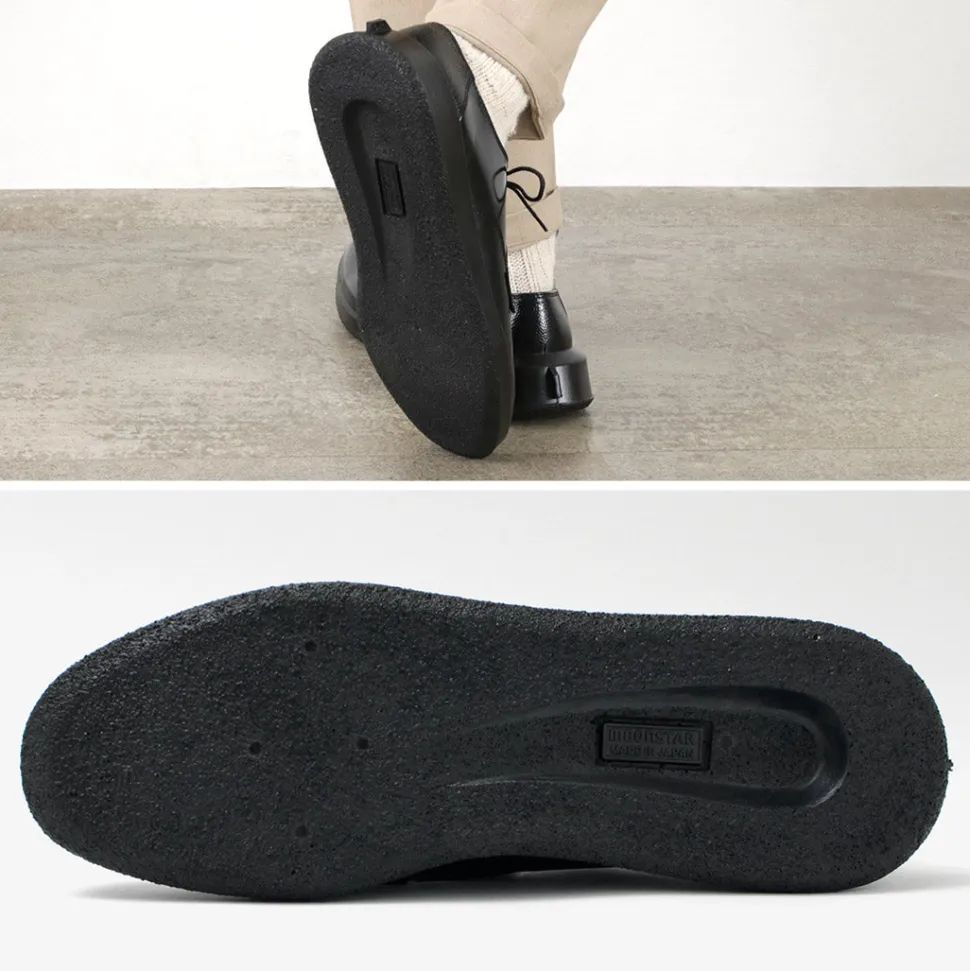 “SHINARI” is a new line of shoes from MOONSTAR. This series incorporates design elements from MOONSTAR’s archives, mainly leather shoes, into a unique sole shape that creates cushioning by flexing the outsole. The simple derby-plain “SUMEN (bare surface)” is a pair that is elegant with its characteristic feather stitching and overlapping patterns, yet comfortable and easy on the feet.