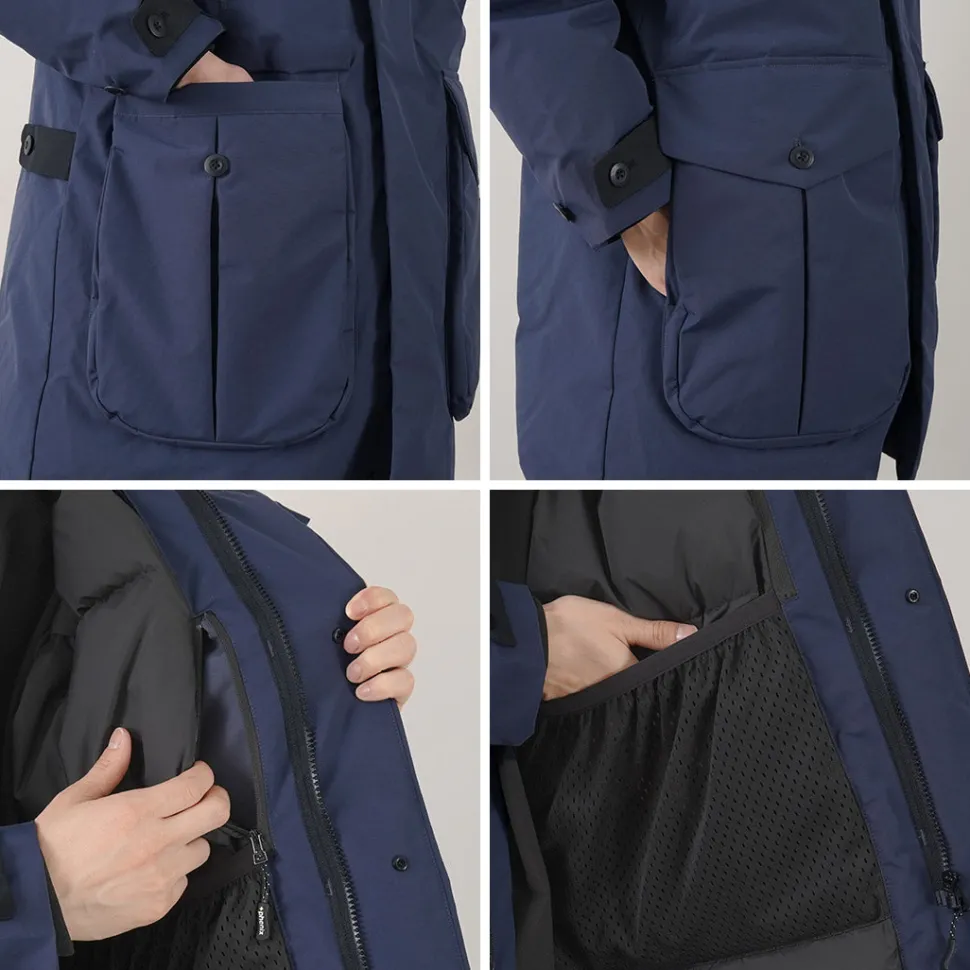 In addition to the superior heat retention of down and the wind and water resistance of Gore-Tex, the large pockets symbolizing the product name “CARGO” make this a piece that can be used in all situations, from urban areas to the nature.
