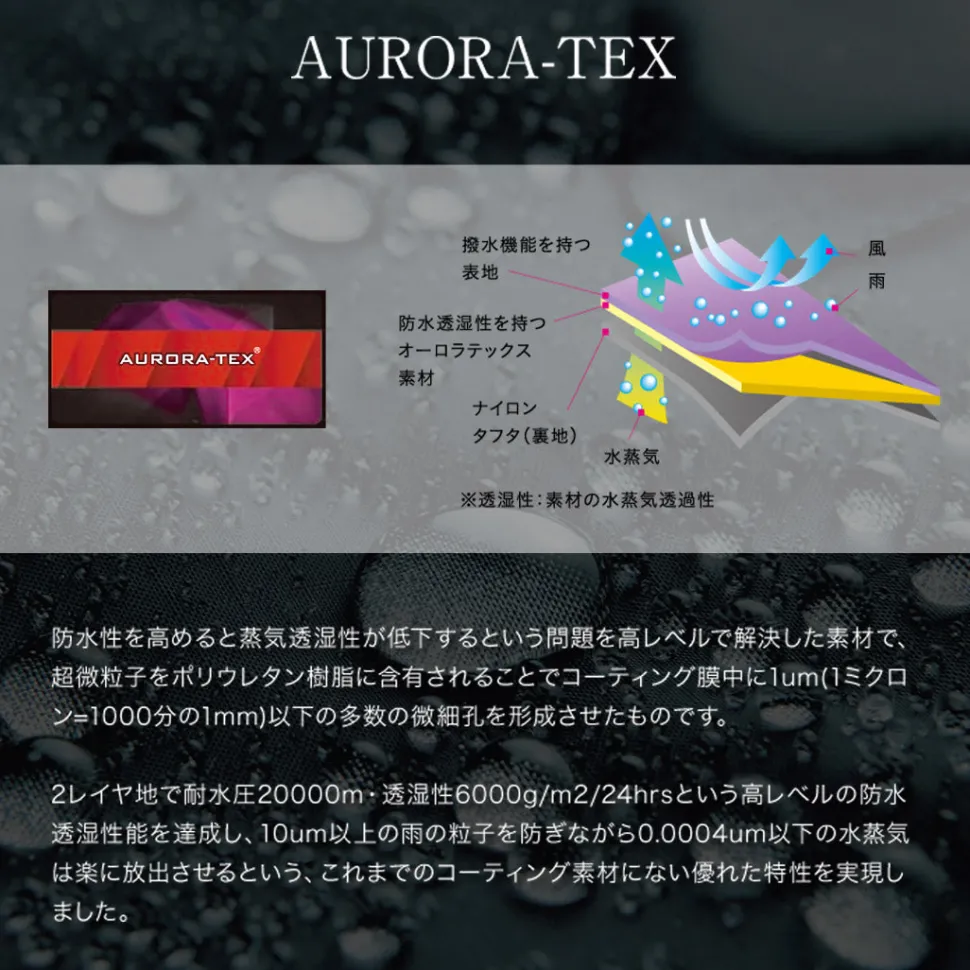 AURORA-TEX is a material that gives high waterproofness while not sacrificing moisture permeability, taking into consideration the weakness of down in terms of wetness.