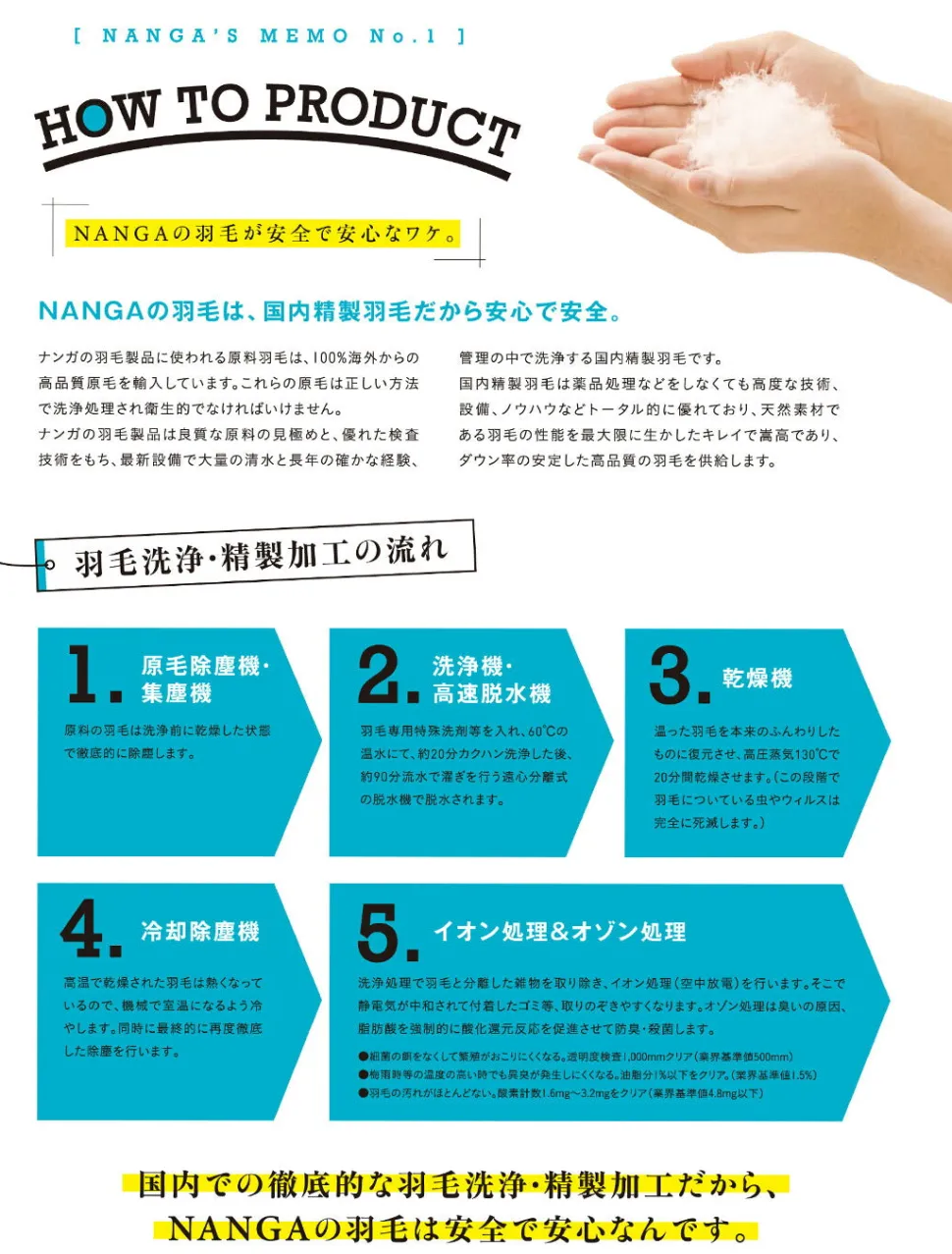 To enhance design and reduce weight, NANGA uses the “non-pack method,” directly inserting down/feathers between the outer and inner layers. While down/feathers may occasionally adhere to the fabric or appear at the seams, this is a characteristic of the manufacturing process and does not affect the product’s quality or performance.