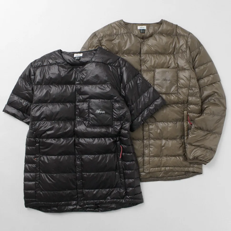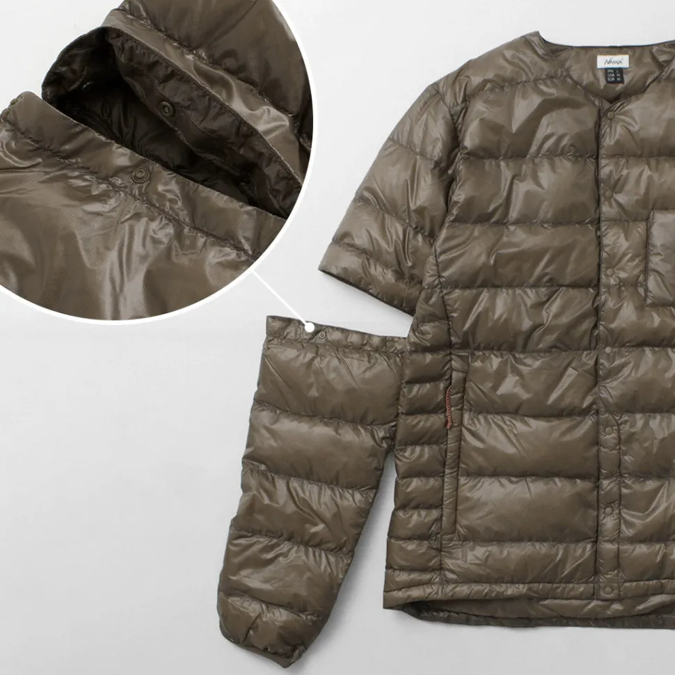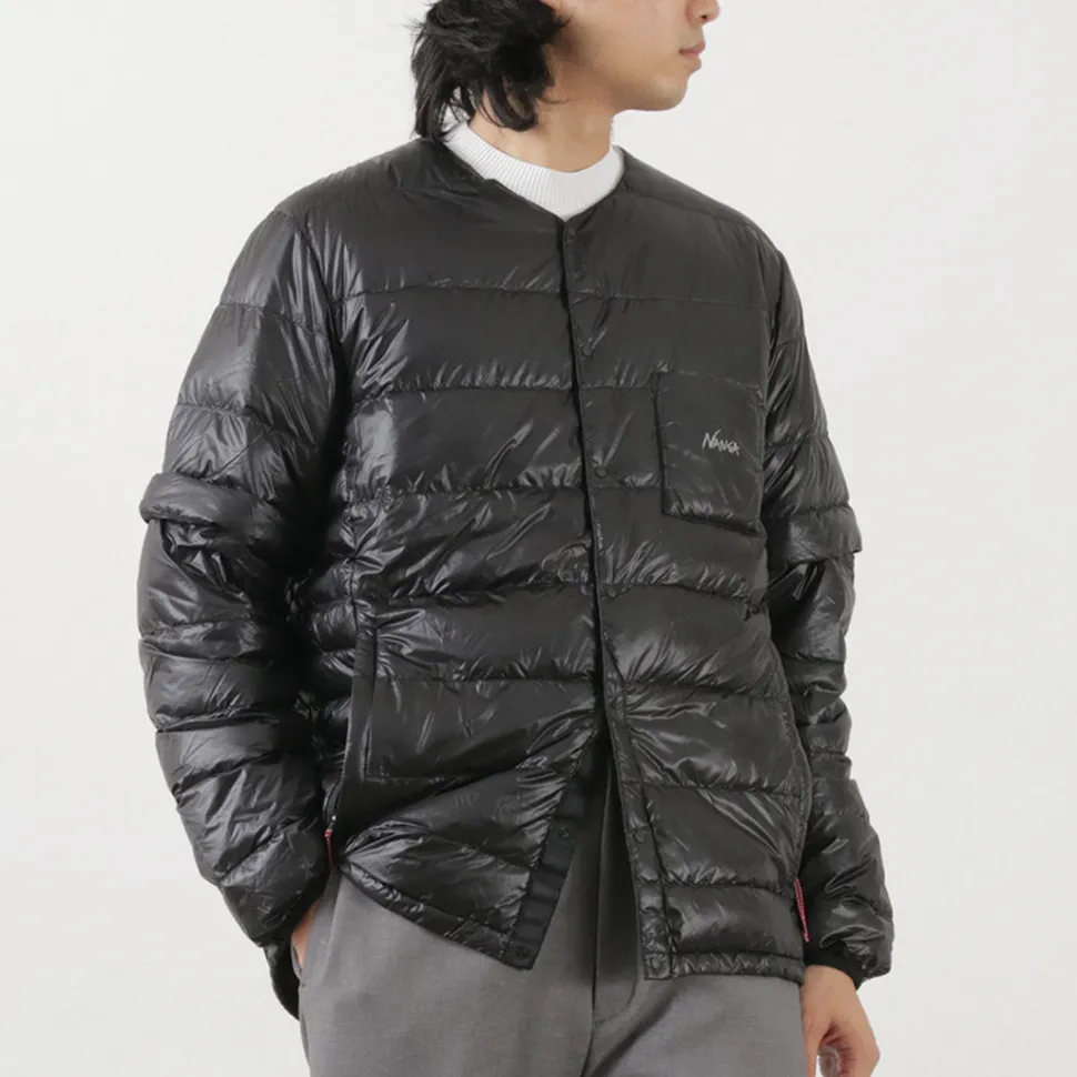 At first glance, this simple down cardigan has detachable sleeves and can be converted into a down tee. It can be worn as inner down as well as outerwear on its own.