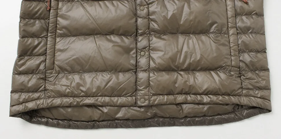 The outer fabric is a densely woven 10 denier ripstop nylon fabric. Although thin, it is highly durable in terms of water repellency and tearing, and the softness of the down gives it an appealing feel.