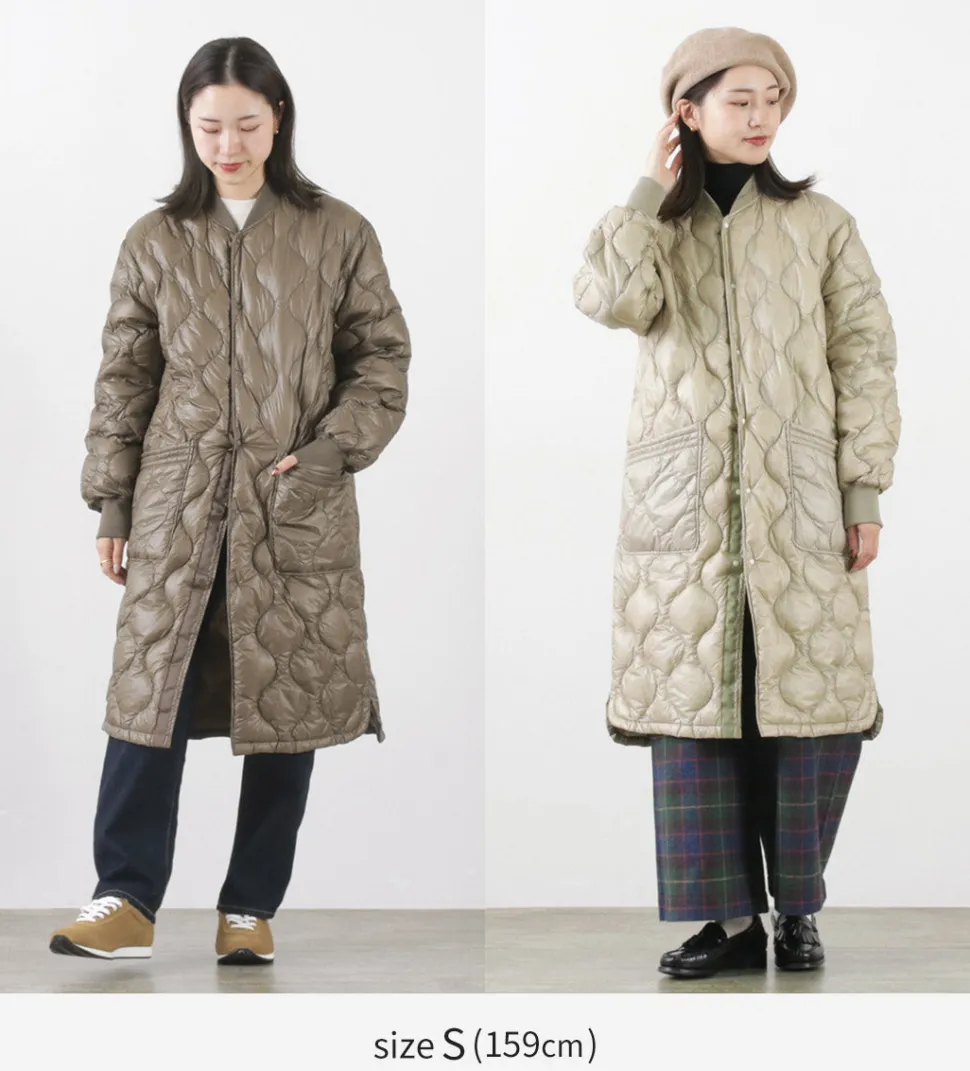 Long down coat with a quilted design based on a military coat liner. Can be worn on its own or as an inner layer for an overcoat, allowing you to enjoy a variety of styling options.