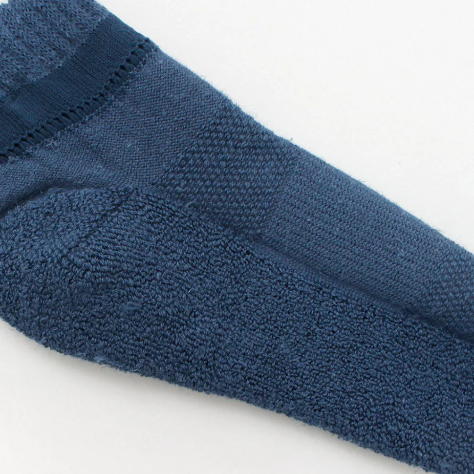 The yarn is made from a blend of organic cotton and hemp from India. Hemp material has water-absorbing and quick-drying properties and natural antibacterial functionality, so it avoids discomfort on the feet, which is a concern.