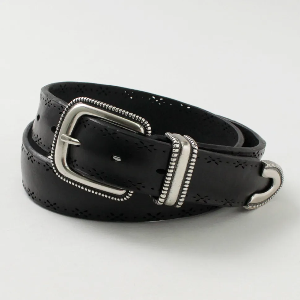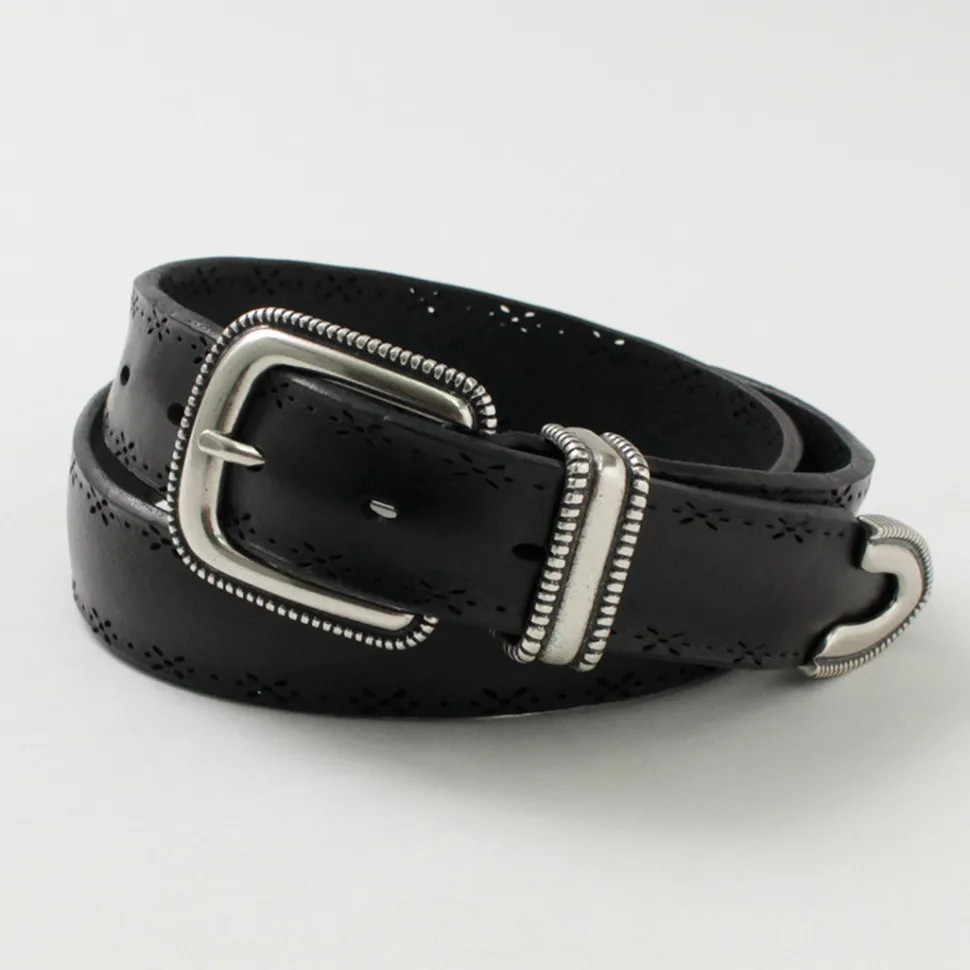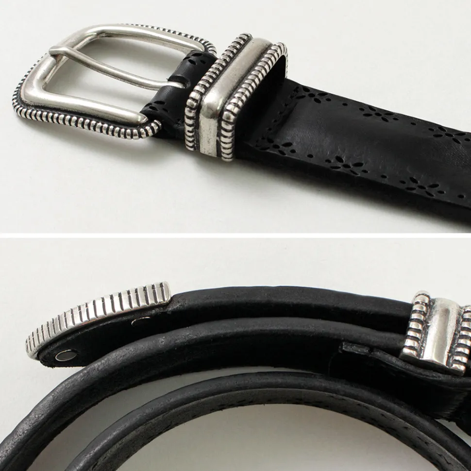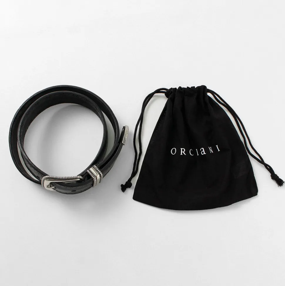 ORCIANI introduces a leather belt that stands out for its delicate details. This item is characterized by its thick and heavy bull hide leather and decorative metal parts. While the look gives off a unique presence, it goes well with a variety of bottoms and can be expected to play an active role in a wide range of coordinates.