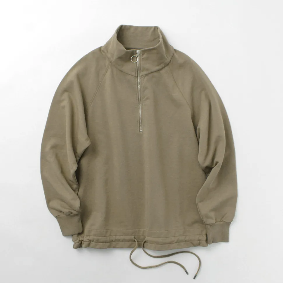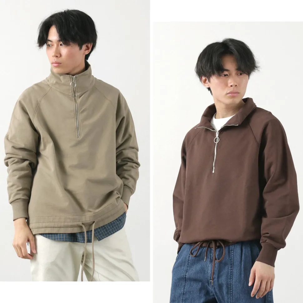 It features a half zip at the neckline. Slightly open in a standing collar state for a sporty look, or fully closed for a turtleneck-like appearance. Moreover, by fully opening and folding down the standing collar, it can also be made to look like a wing collar. Whether open or closed, it adds to the overall look, and it pairs well with shirts or T-shirts for layering.