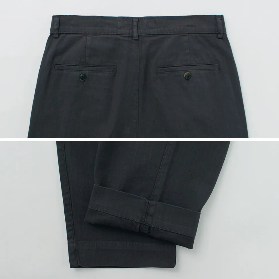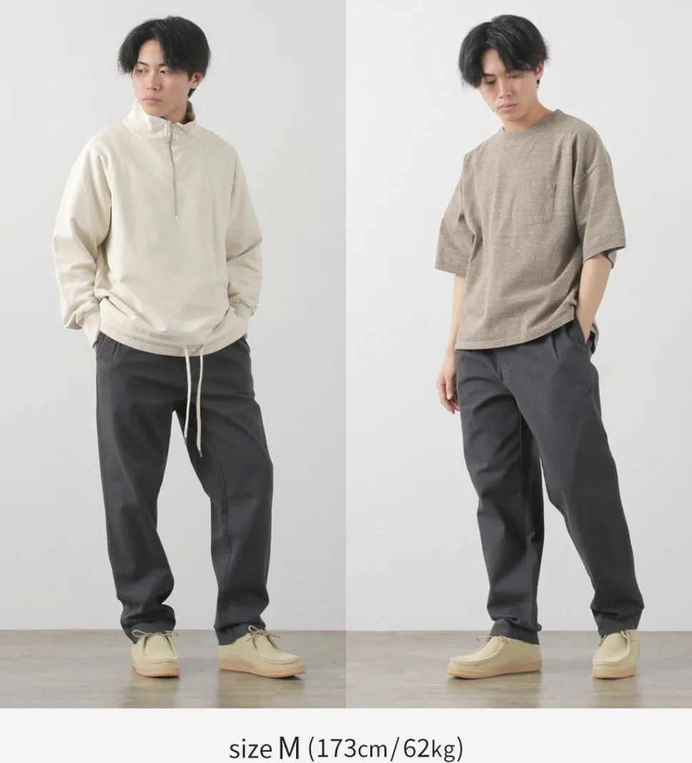 It uses twill fabric with moderate thickness. It is finished with a natural texture unique to 100% cotton, featuring a soft texture that feels good on the skin from the beginning. Moreover, it has a faint gloss characteristic of herringbone on the surface, which matches well with clean-cut coordinates, despite being a casual material.