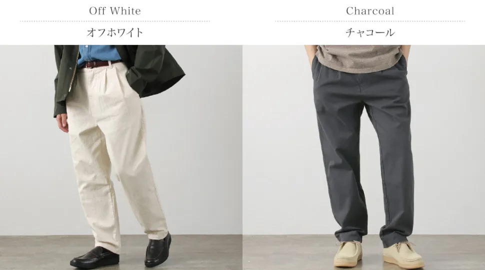 The front features a durable YKK zipper fly. It uses high-quality corozo buttons used in men’s suits, adding a subtle accent to the coordination. It has two pleats at the waist, providing a comfortable fit around the waist while allowing roominess and enhancing ease of movement.
