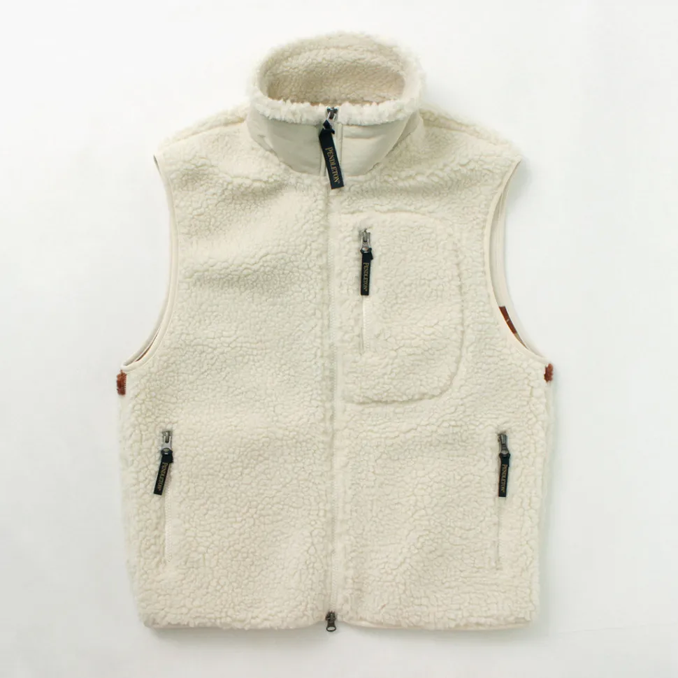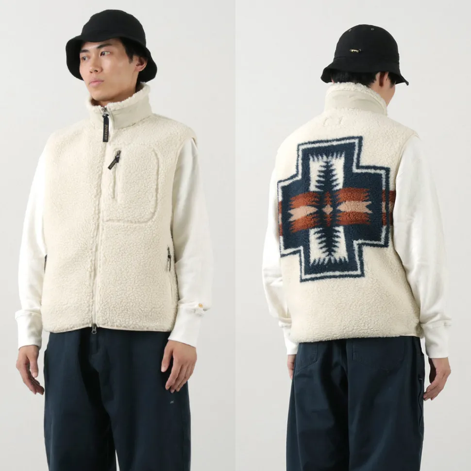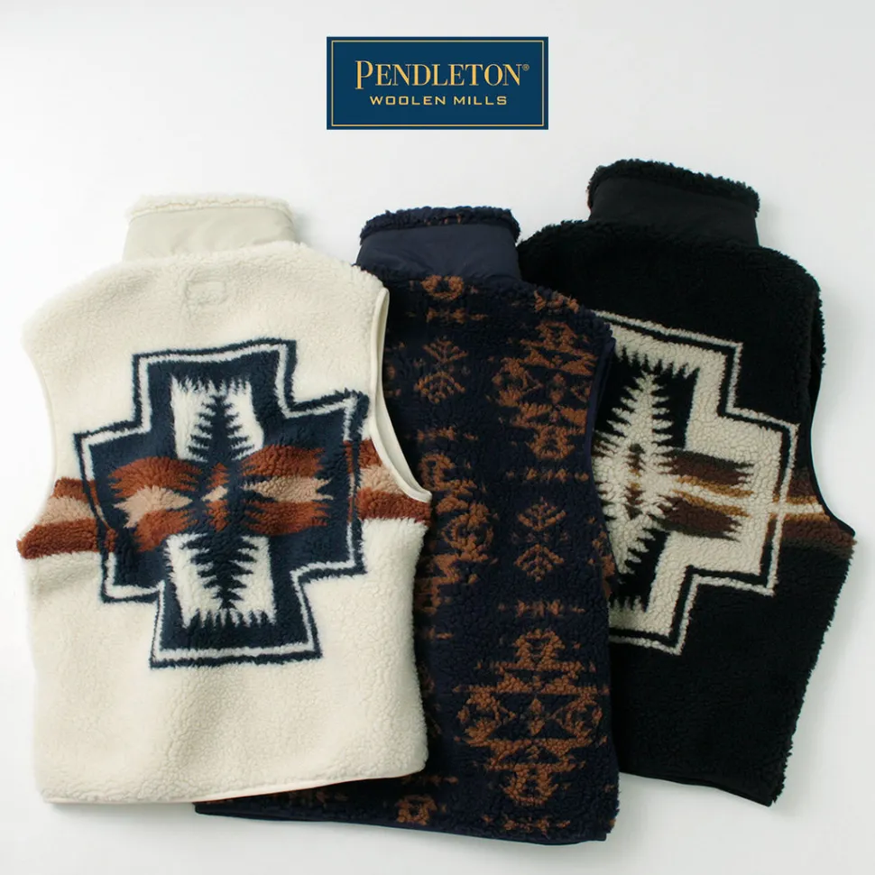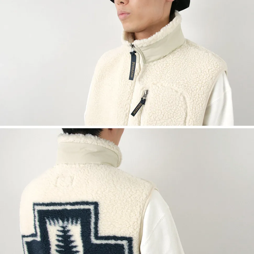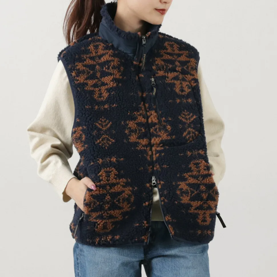 Zip boa vest with PENDLETON’s unique native pattern. With a warm stand collar and double zipper, this vest can be worn in a variety of ways.