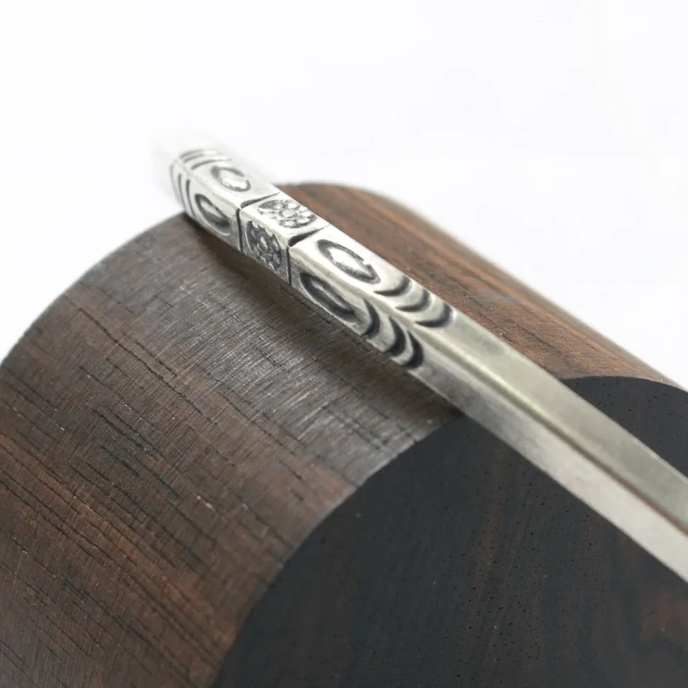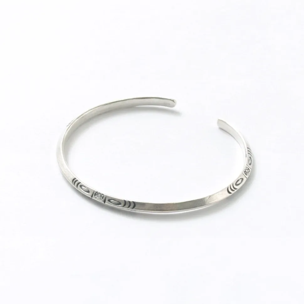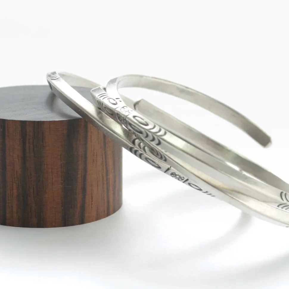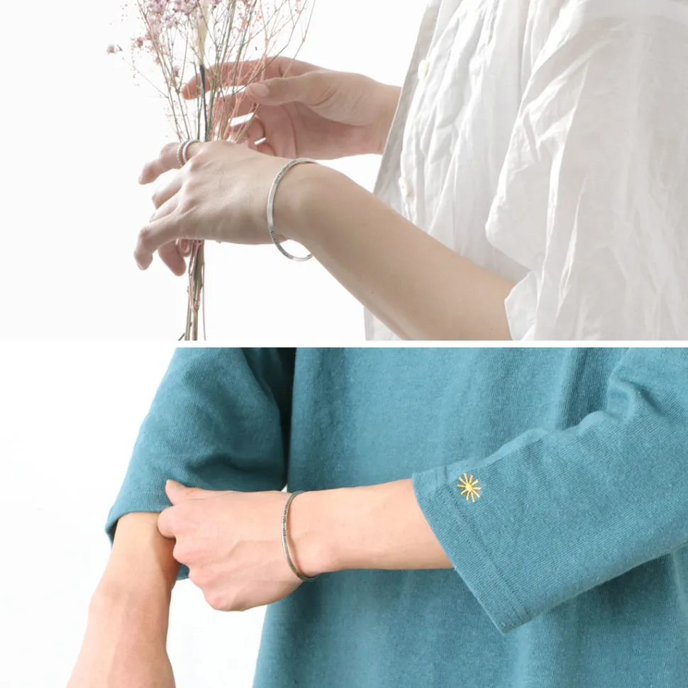 Handmade silver bangles with Karen stamped worksThe Karen silver bangles are handcrafted one by one with beautiful details. The silver is pure and a little soft, making it easy to wear, and it has a dull shine that is not flashy but has a strong presence and a unique warmth.