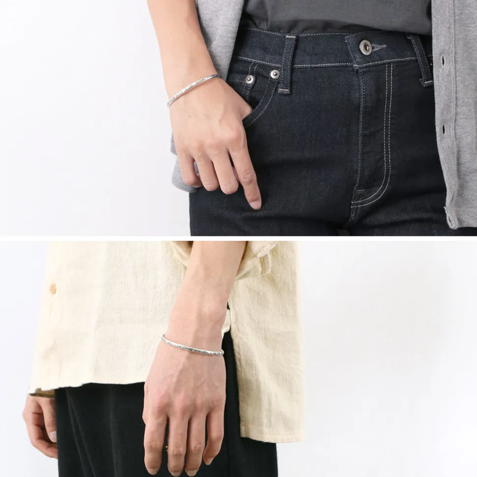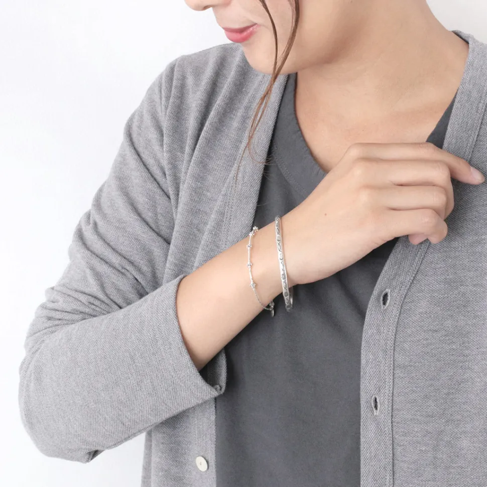 Handmade Silver Bangle with Karen Stamp WorksThe Karen Silver Bangle is a beautiful, finely crafted bangle that is handmade one by one. The silver is pure and a little soft, making it easy to wear. Stampworks is a type of stamp work that was invented by Navajo silversmiths in the 1880s. It is a technique in which a pattern is engraved on the tip of a steel blade to create a stamp, and then the blade is hammered onto the surface of the silver to create a variety of designs. The high purity of silver allows it to be made smaller or larger with relative ease. If too much force is applied, the metal will harden in that area due to the nature of the metal, causing metal fatigue. Please be gentle when adjusting it, as it may lose its shape or break. Length: approx. 15.5cm Weight: 11g Size: Free (unisex/adjustable) Country of Origin: MADE IN THILAND Material: Silver Silver (95%-99%)