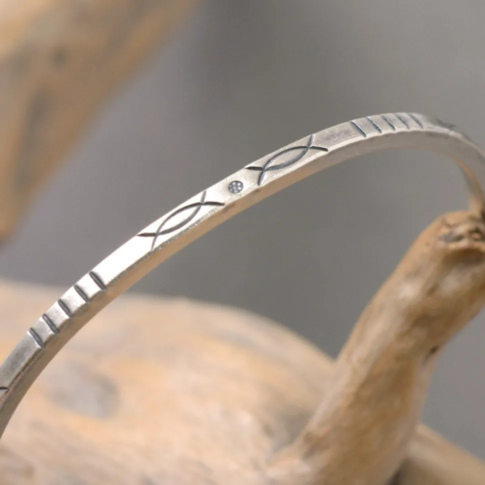 This silver bangle adorned with beautiful stamped artwork adds a touch of glamour to your look. Each piece is handcrafted, allowing you to enjoy its rich expression.