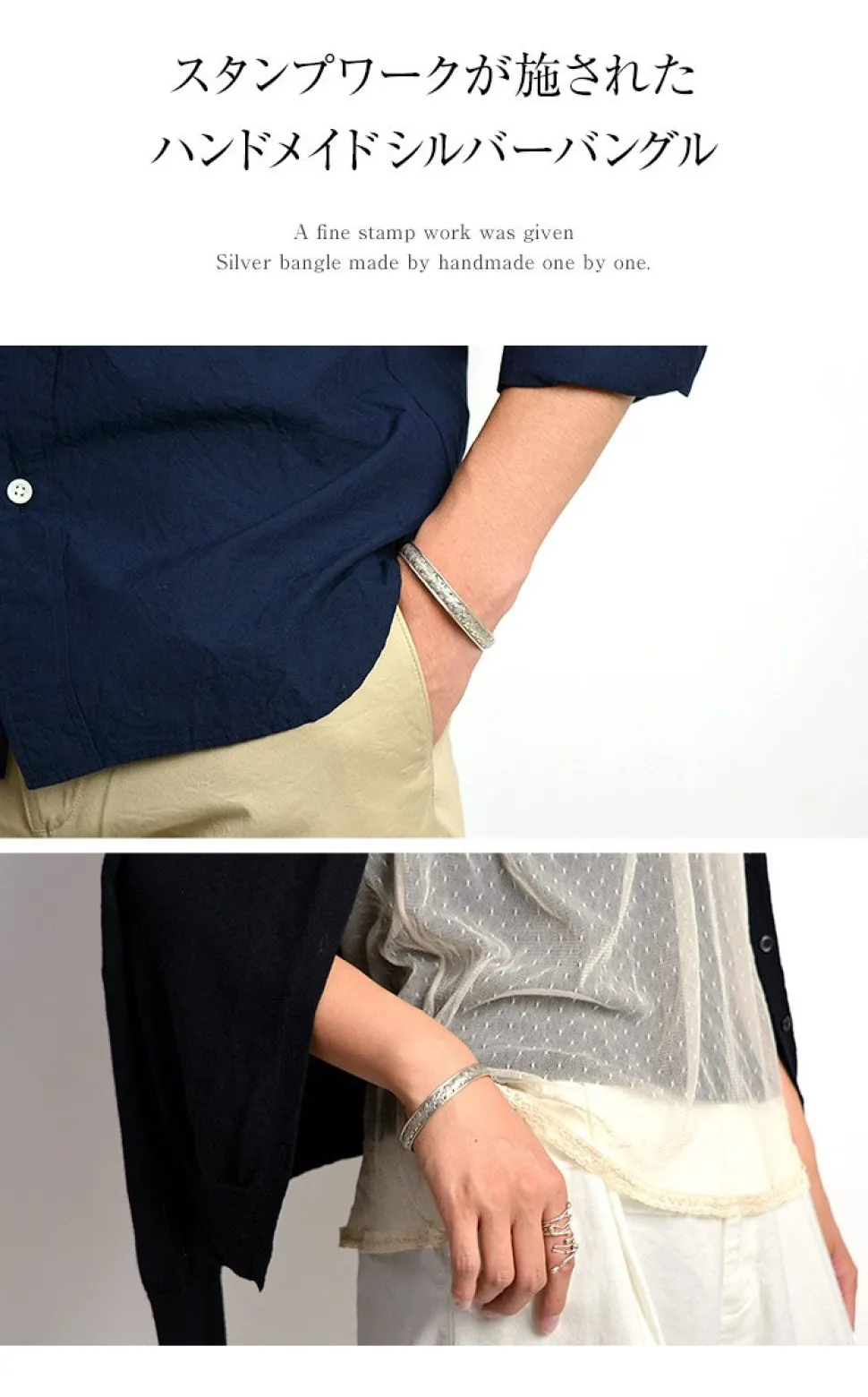 Handmade silver bangles with stamp workThe Karen silver bangles are handcrafted one by one with beautiful detailed workmanship. The purity of the silver is high and it is a little soft so it is easy to wear, and the dull shine is not flashy, but it has a strong presence. It is a silver bangle that has a unique “warmth” to it. This bangle is stamped with the meaning of “amulet to protect you from the four directions”, so why not wear it as a good luck charm? The warmth of “Karen Silver” is completely different from that of machine-made jewelry. It is made one by one by hand, so each piece has a different expression. The warmth and individuality of Karen silver is one of its characteristics. A unisex item that can be enjoyed by both men and women The bangle is a simple item with a strong presence that can be used as a point of coordination. We recommend stacking them with other bracelets, so you can enjoy various combinations.