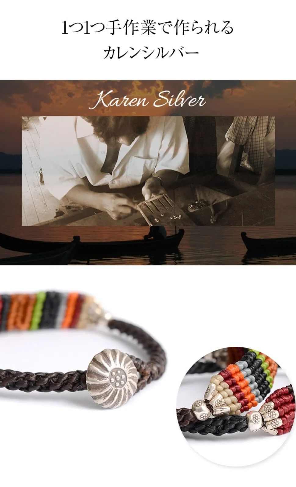 The fine silver work and multi-color appeal of this bracelet is the tough detail of the colorful waxed cord twisted and braided. The fine silver work accents the bracelet and gives it a strong presence. The bracelet is made of a material that can be used in the shower, at the beach, and in the water, so you can enjoy summer activities with it on! This item is sure to enhance your summer style as a coordinating accent. Waxed cord is made of polyester fibers that are soaked in wax and spun to make the normally sturdy cord tougher and more durable. This is a high purity silver. While most silver jewelry is 92% pure, Karen silver is 95-99.9% pure. It is available in three sizes for both men and women, and can be worn alone or stacked depending on your mood.