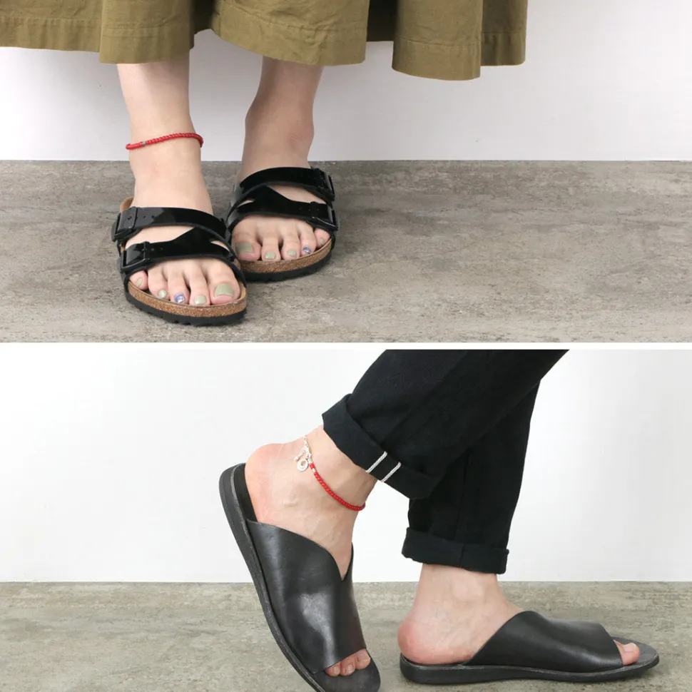 The smooth surface and shiny bright red color of this anklet is enhanced by the arrangement of the Karen silver, which brings out the charm of the anklet even more effectively. It is simple but has a strong presence, and will add a glamorous touch to your feet.