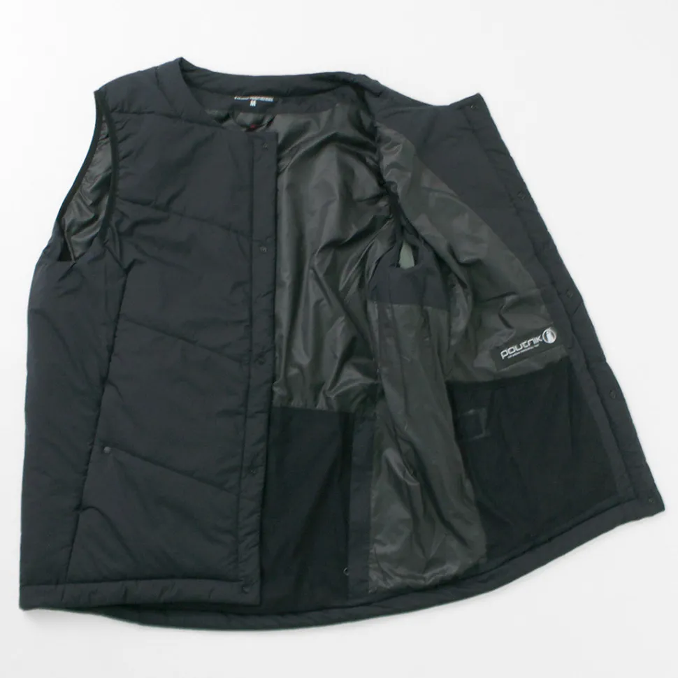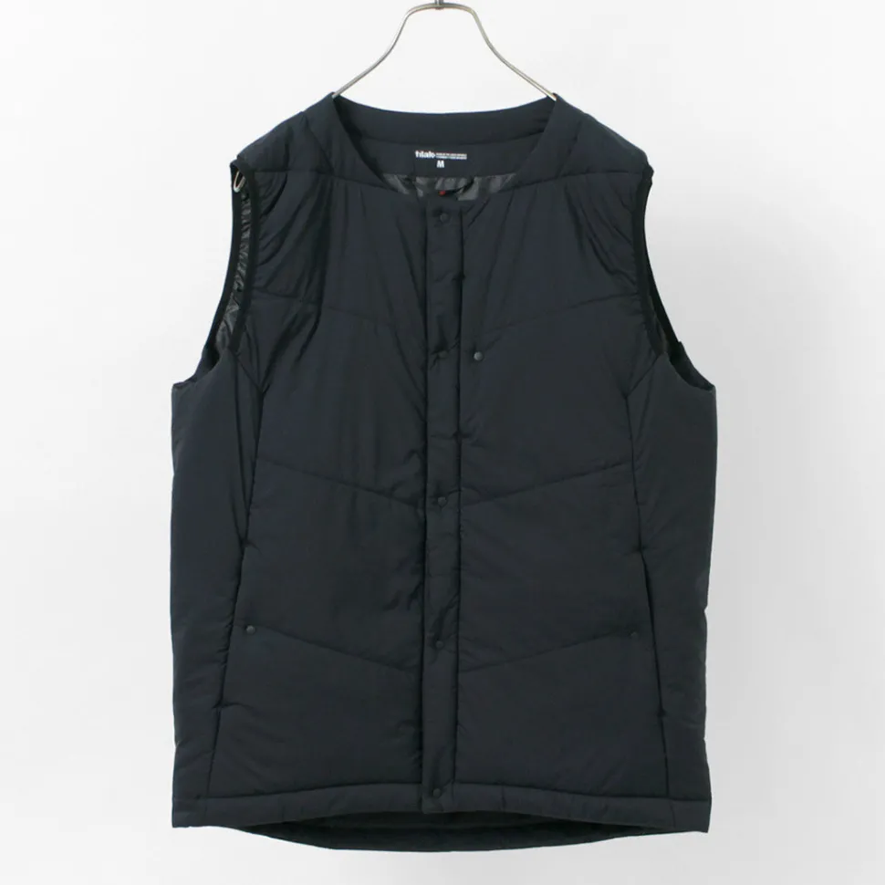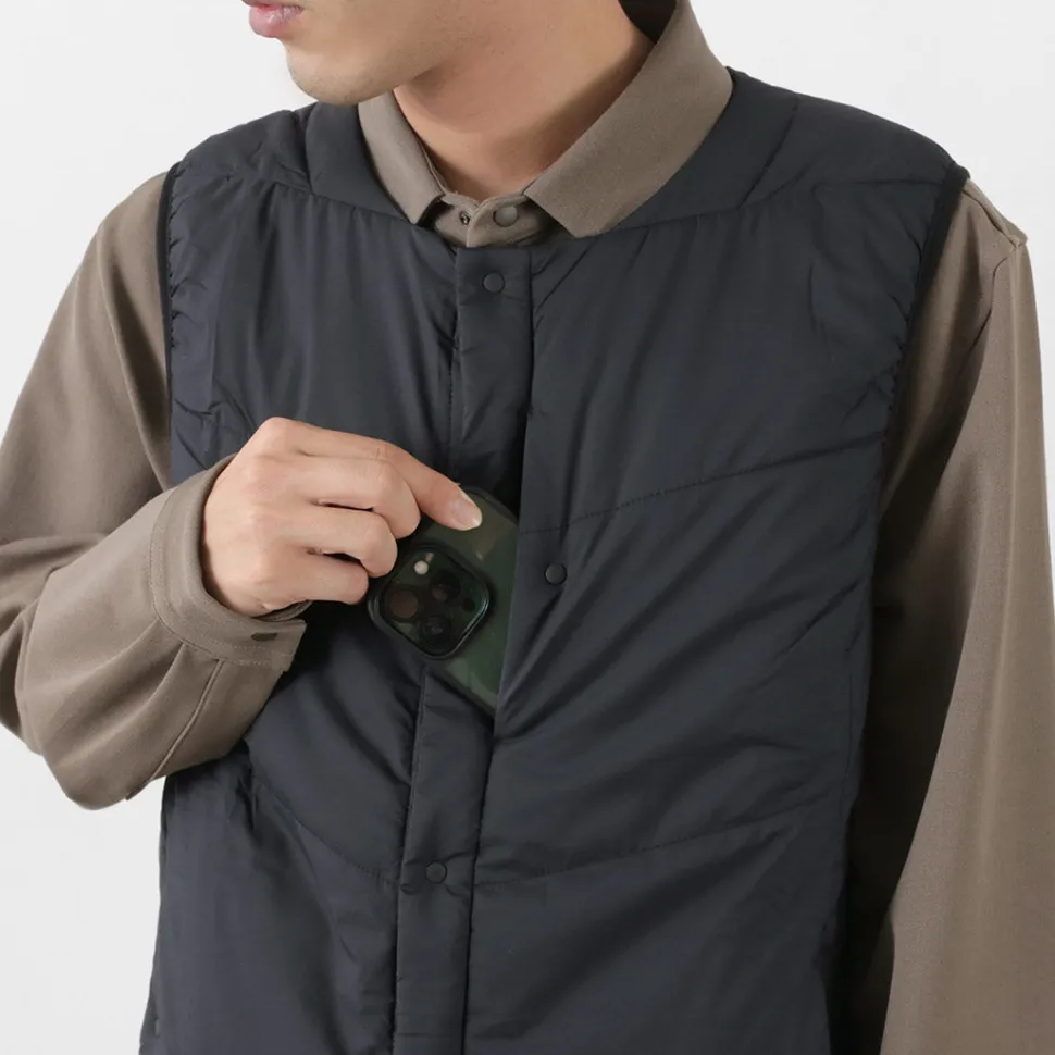 “TILAK / TILAK” brings you a crew neck insulated vest. The biggest point is the fabric that uses lightweight, windproof and water-repellent “PERTEX microlight” for the outer fabric and “CLIMASHIELD APEX” synthetic fibre cotton for the inside, which is resistant to water damage and does not reduce the warmth of the fabric.