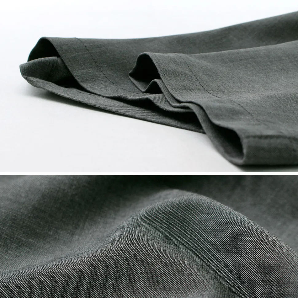 These slacks are made of Tro, a standard spring/summer suit material. The matte glossy fabric is combined with a moderately relaxed tapered silhouette to create an item that combines elegance and casualness. High durability is combined with elasticity for a comfortable fit. Can also be worn as a set-up with a jacket of the same material.