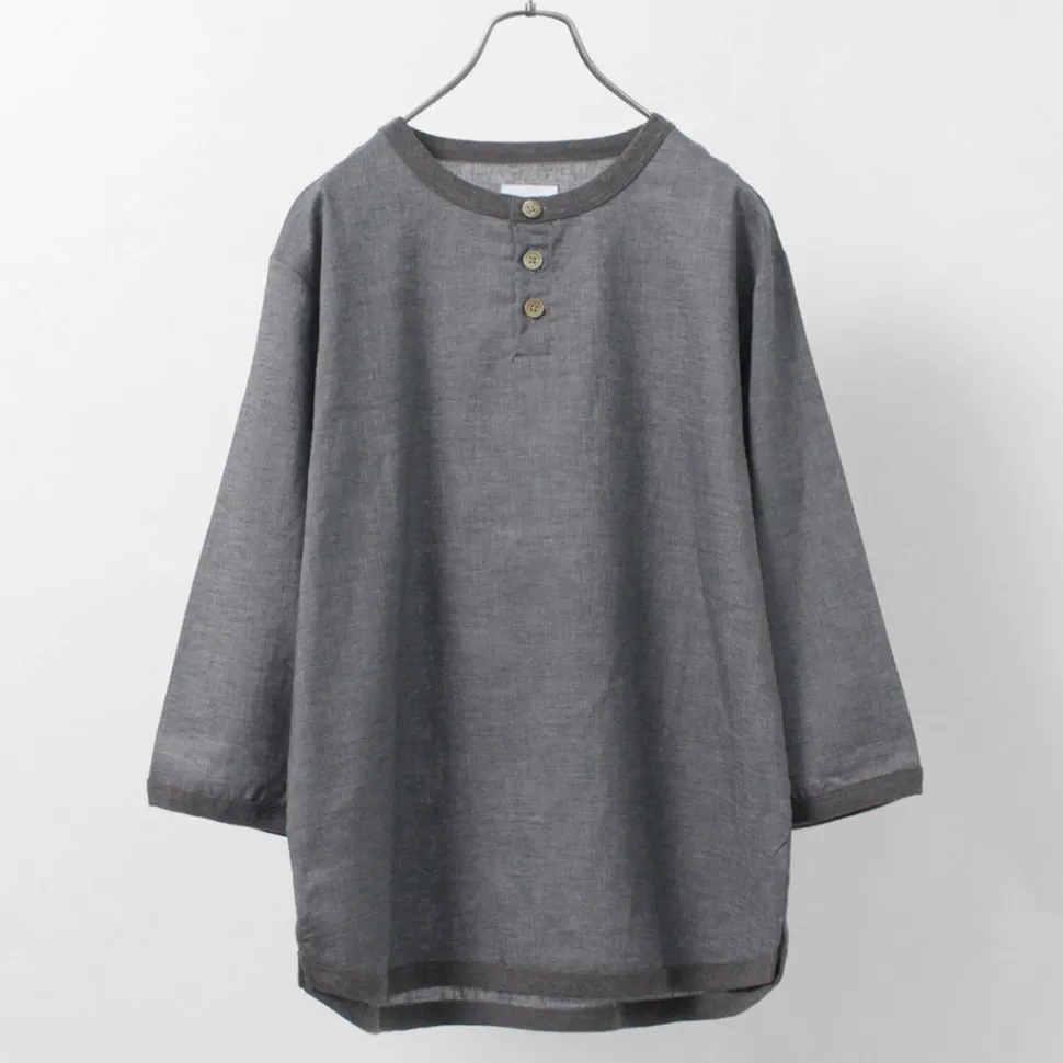 The henley neck design allows various nuances to be expressed by opening and closing the buttons. The luster of the brown-lipped shell buttons creates an elegant atmosphere.