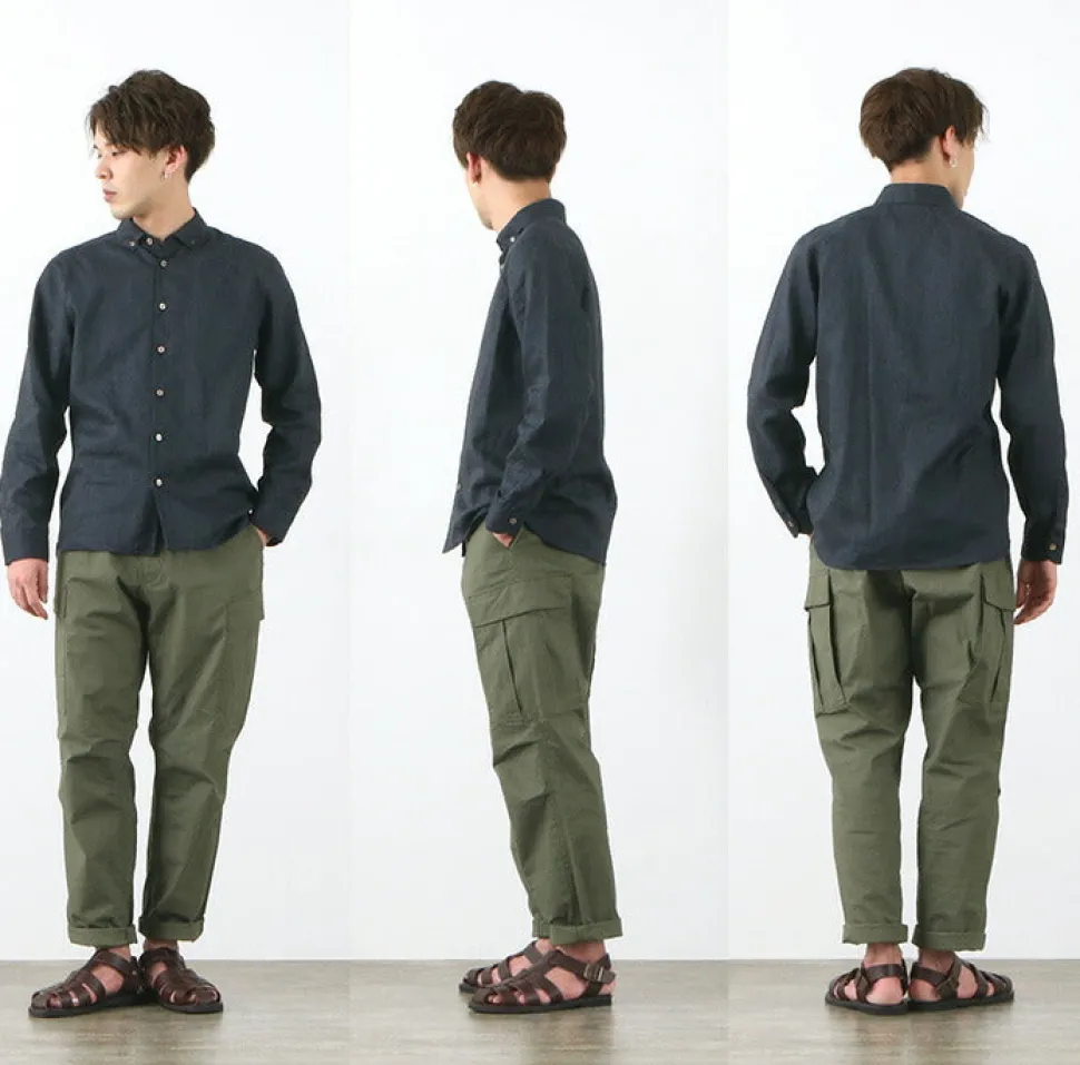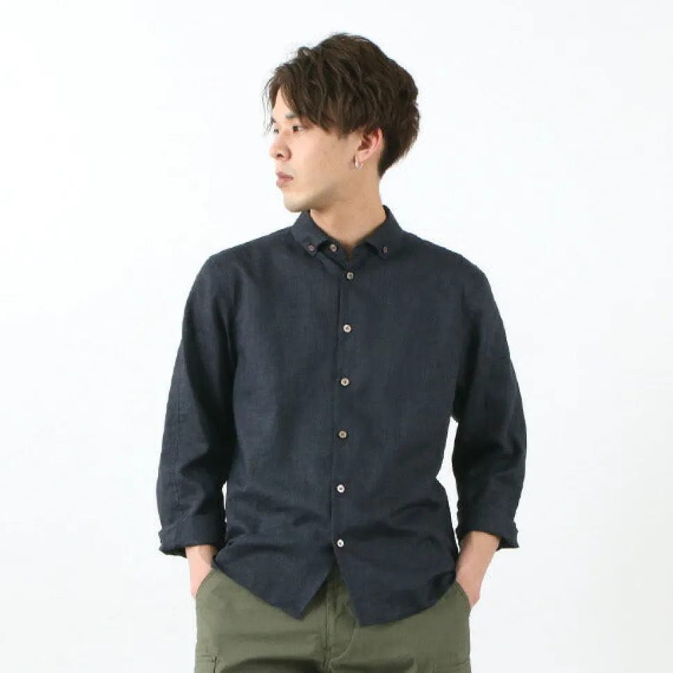 Button-down shirt made of classy linen canvas. The coolness characteristic of high-quality linen material and its lightweight comfort are attractive. The split raglan sleeves allow for a wide range of motion, making it easier to move around and more relaxed than it looks. Linen with excellent water absorption, wicking and durability Canvas