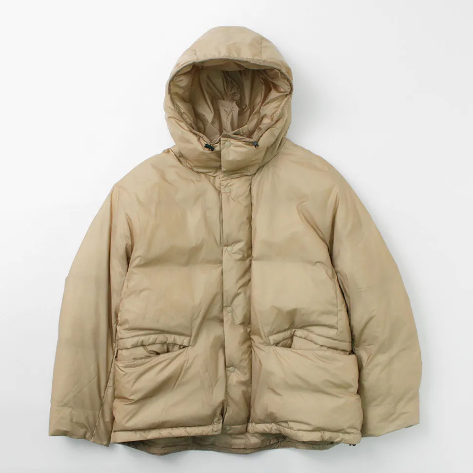 In addition to a nylon fabric that is one-half the usual lightweight, this jacket is made with a focus on lightness by eliminating all unnecessary details such as decorative designs, metal parts, and seams around the shoulders. The water-repellent finish applied to the fabric and the down feathers contained within provide warmth and comfort despite the light weight.