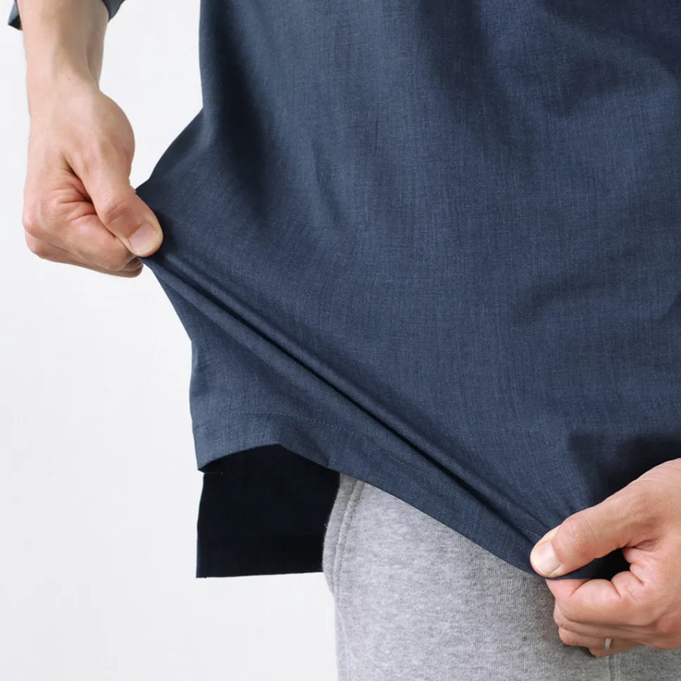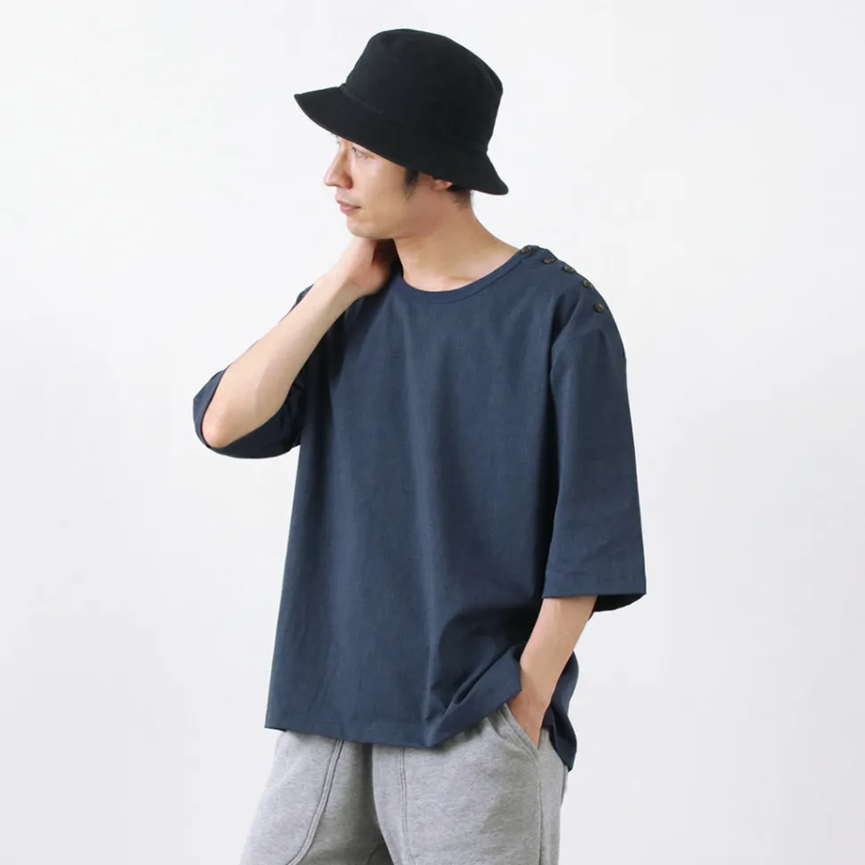 Short-sleeved T-shirt in a hybrid fabric blended with ramie, a type of hemp, and the functional material “COOLMAX yarn”. The buttons on the shoulders are reminiscent of sleeping shirts. A piece with shoulder button accents reminiscent of a sleeping shirt.