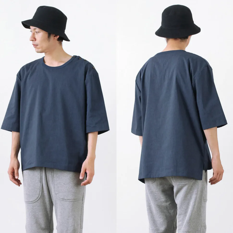 Short-sleeved T-shirt in a hybrid fabric blended with ramie, a type of hemp, and COOLMAX yarn, a functional material. This piece is accented with shoulder buttons reminiscent of a sleeping shirt. The