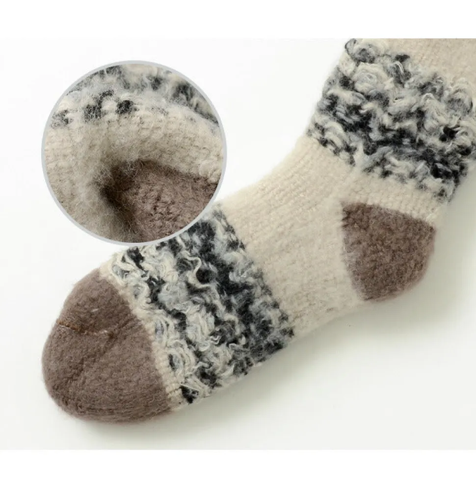 material is a warming bulky yarn made from a wool and acrylic blend. After knitting, each piece is turned inside out and brushed on the inside to further increase warmth retention. Thick enough to stand on its own, it protects your feet from the cold.