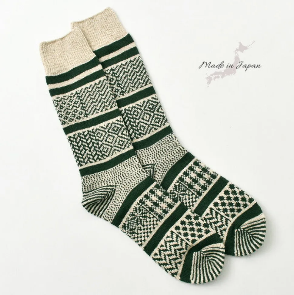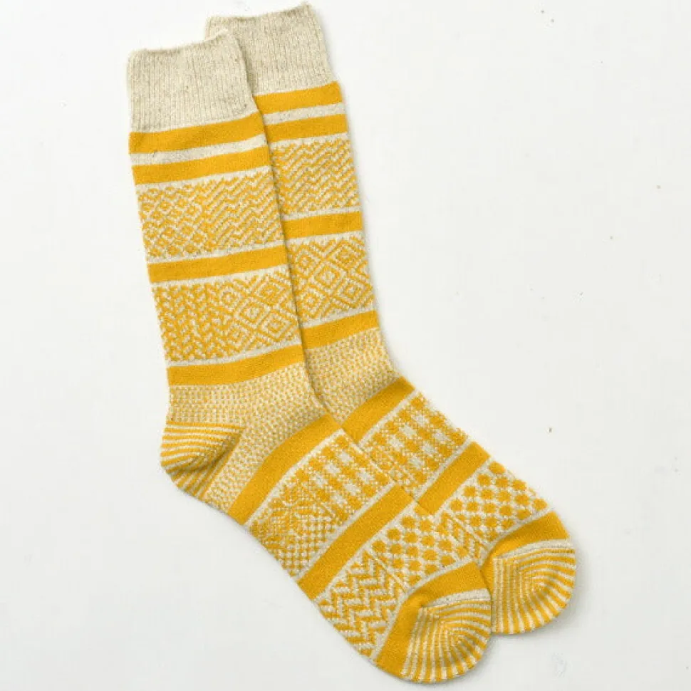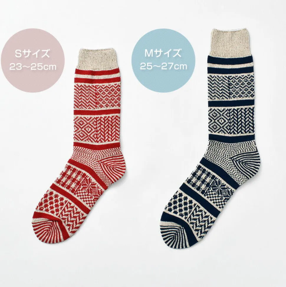 Crew socks with a mixed design of various jacquard patterns. The three-dimensional Jacquard weave has a stiff image, but the silk-blended fabric used in these socks is smooth to the touch.