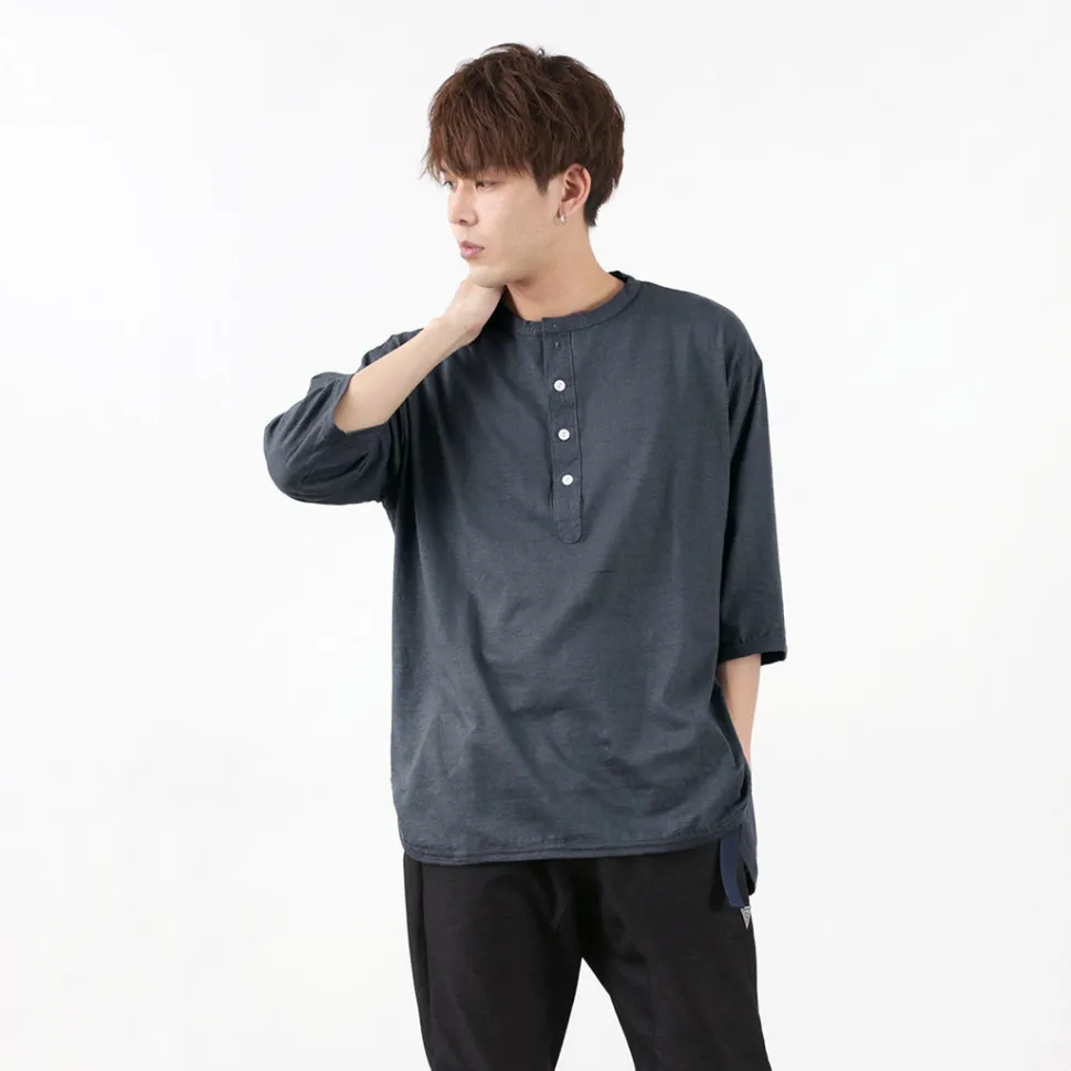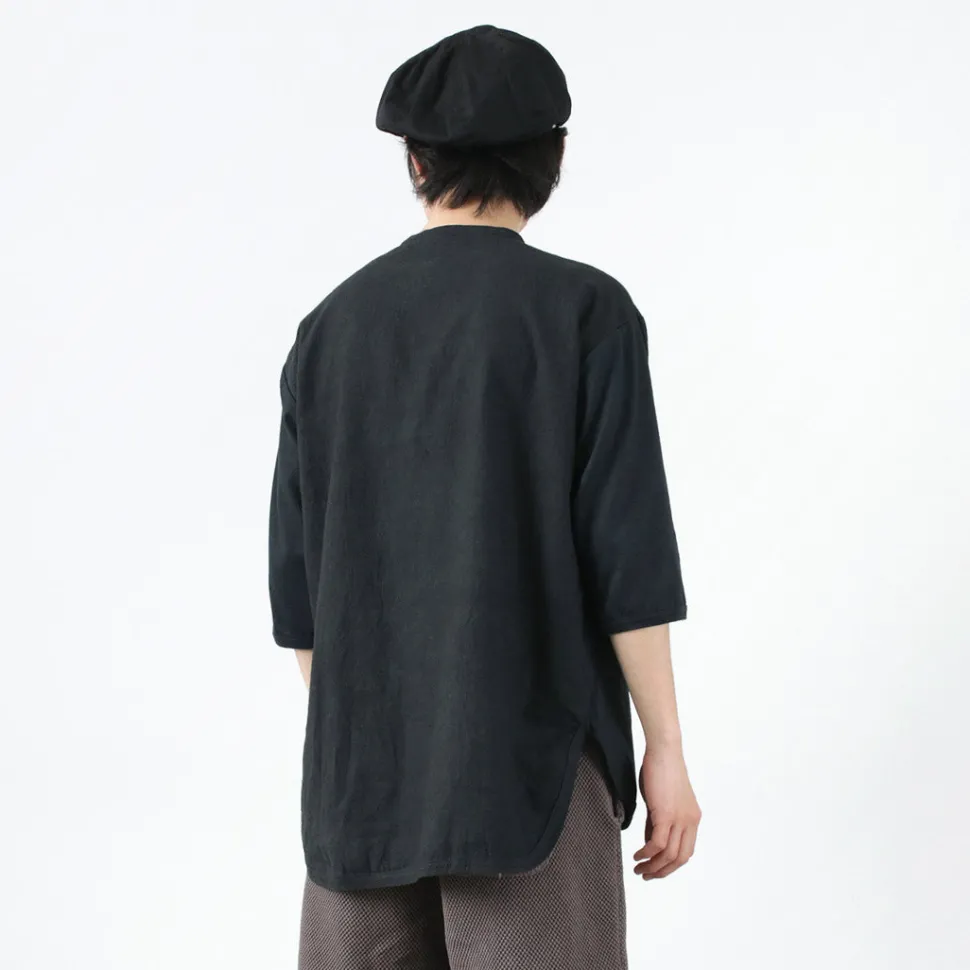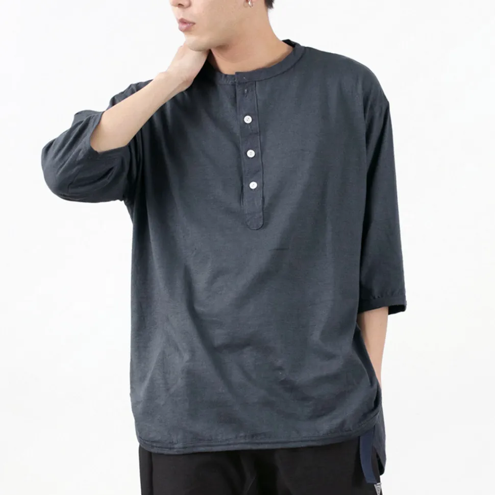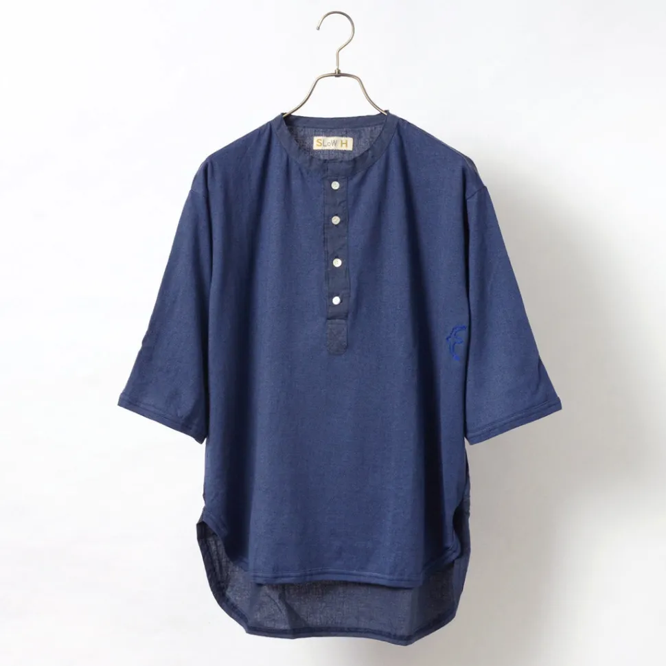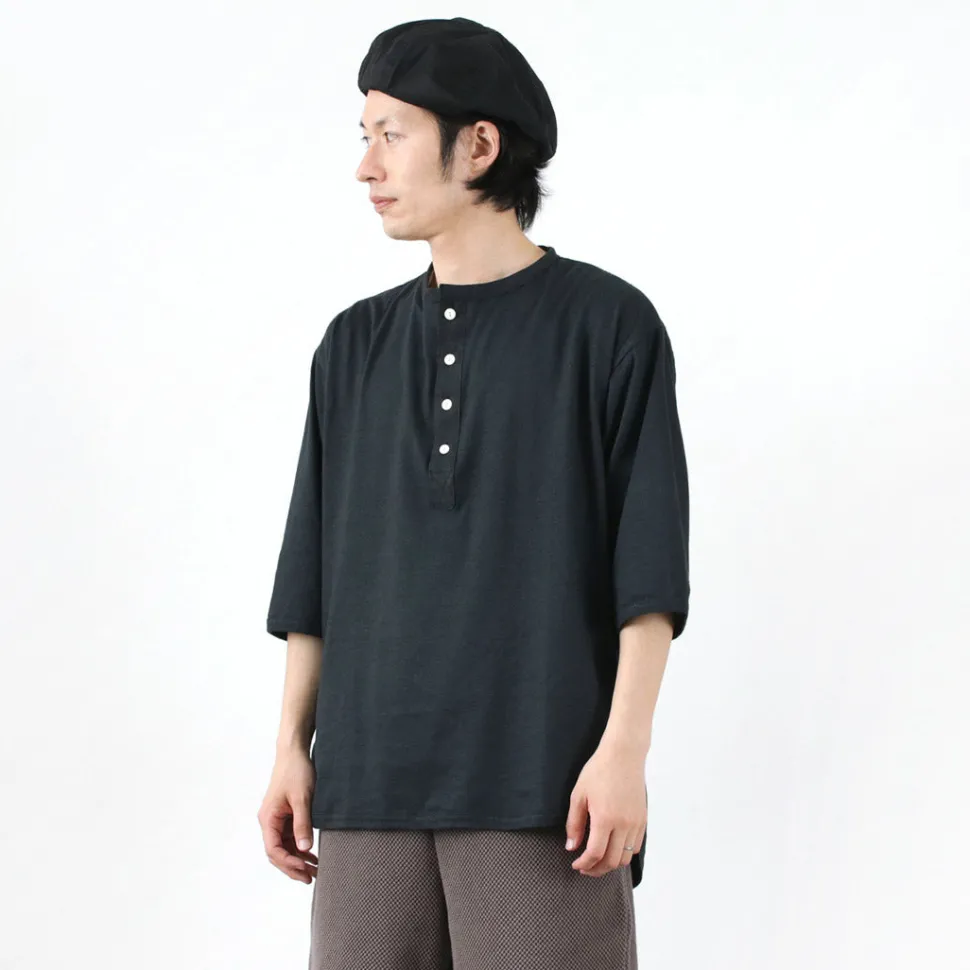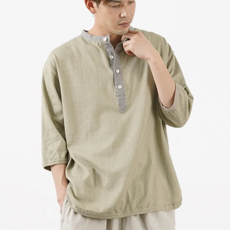 The neck and placket are made of the same shirt fabric as the back of the shirt, with a henley neck. The buttons are made of natural shell buttons with an attractive sheen.
