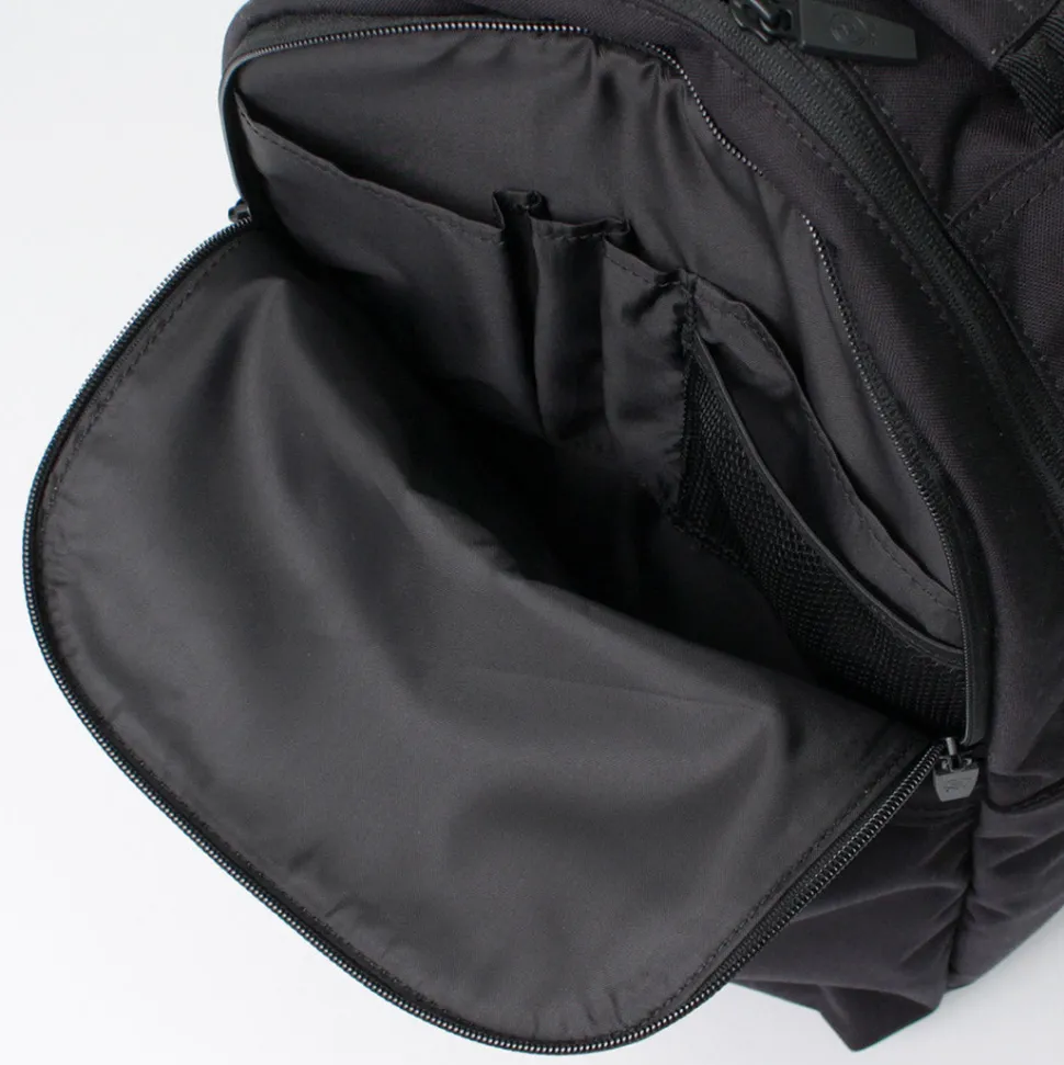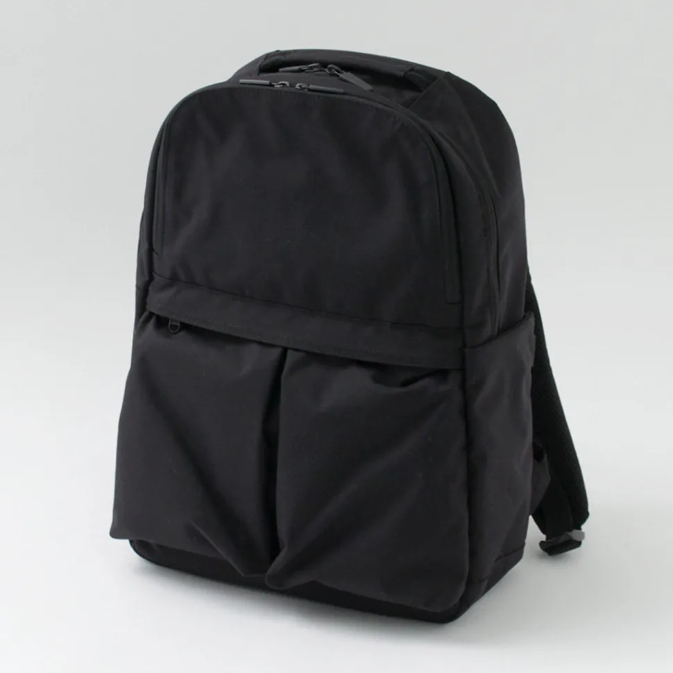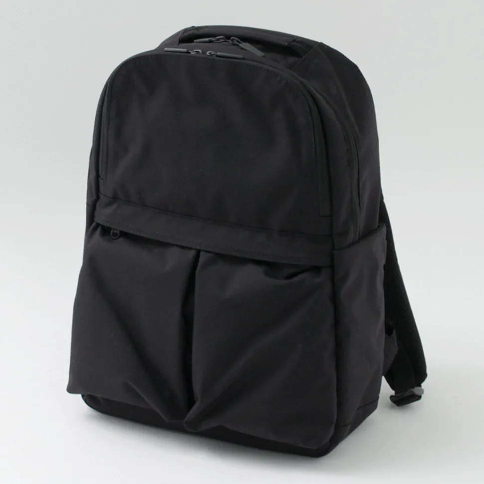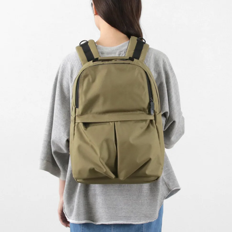 The design of this daypack is based on the helmet bag, which originated when U.S. Air Force pilots carried their favorite helmets. It features a helmet bag-style arrangement tucked into the front pocket.