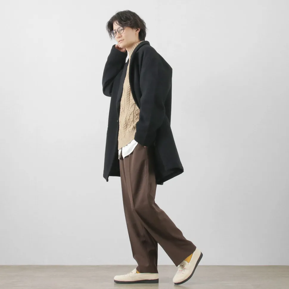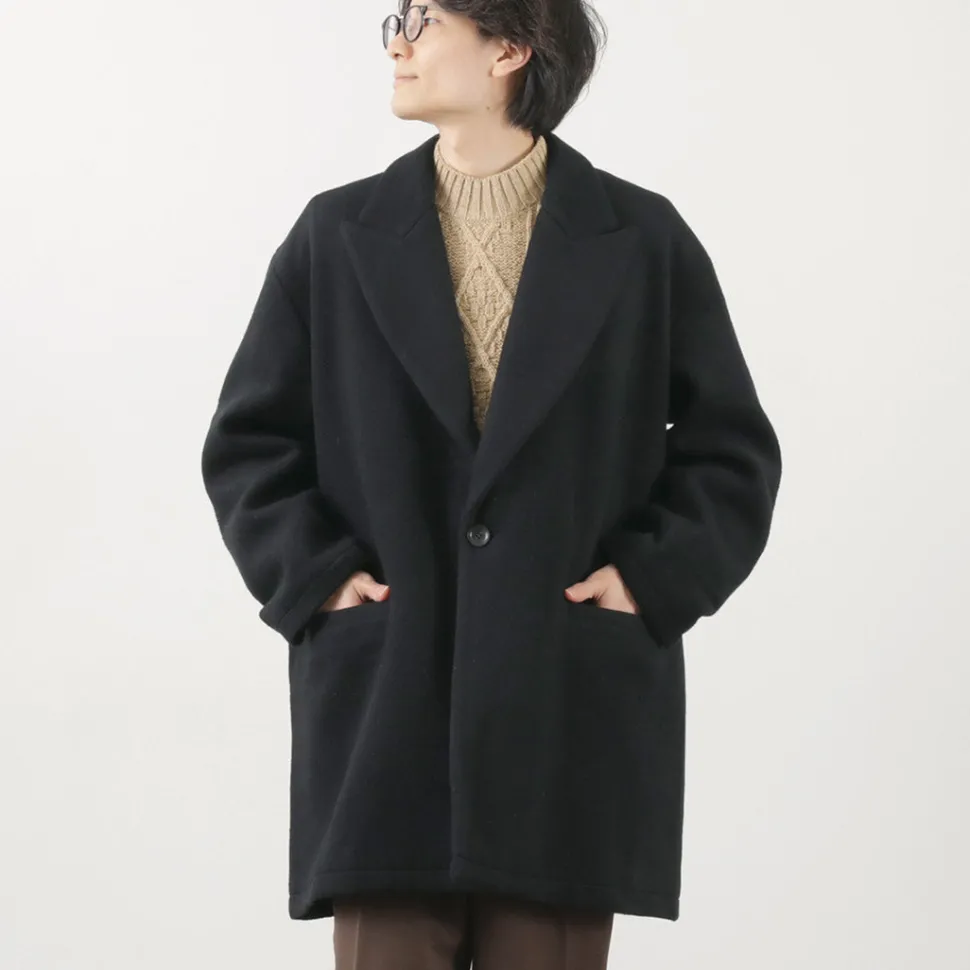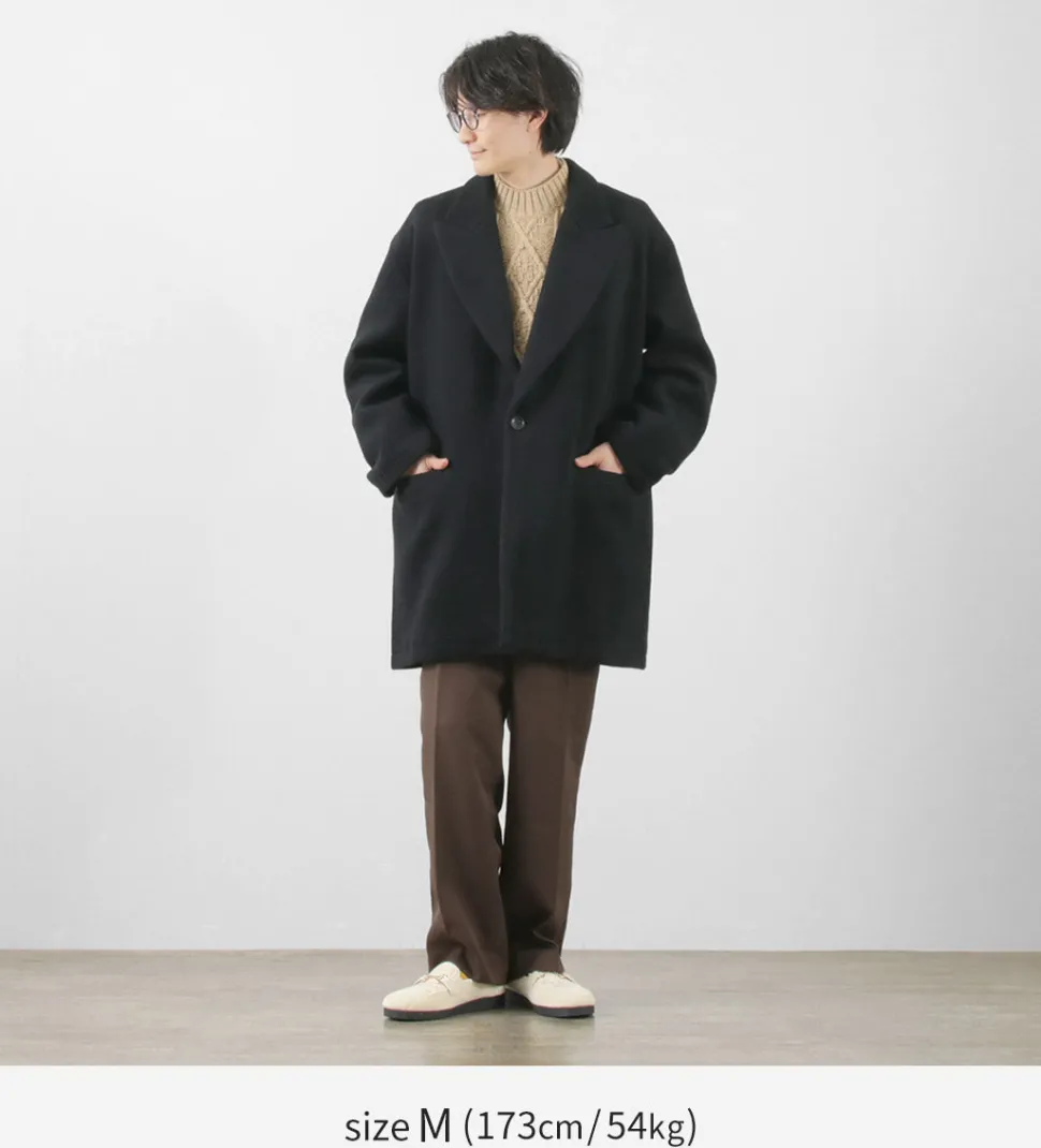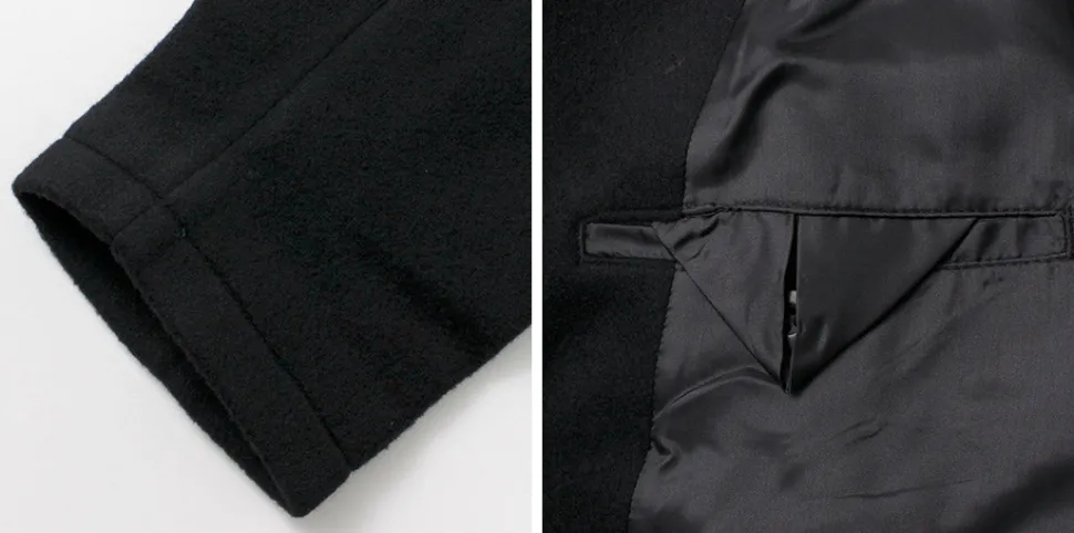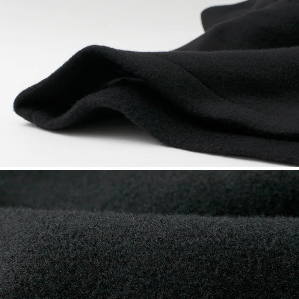 The fabric is made from wool, and it undergoes a process of felting to create a beaver-like finish. It has a soft touch and a glossy, refined appearance. Despite its substantial thickness, it feels light to wear and offers excellent insulation.