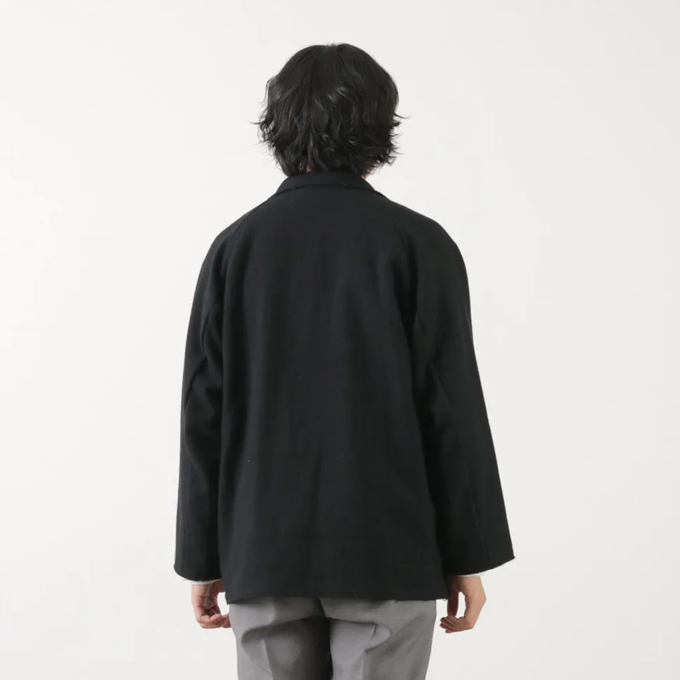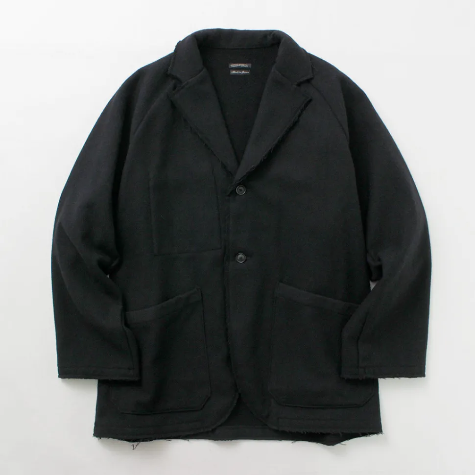Introducing a jacket designed based on American medical wear. This item has an elegant tailored jacket with cut-off details for a rough finish, giving it a good sense of slackness. Warm wool mosser fabric is used for the fabric, creating a seasonal mood.