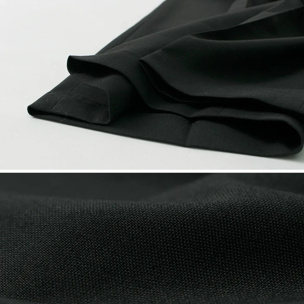 The rise is shallow, and the hips are tapered with roominess. The slightly slim silhouette and center tuck create a relaxed yet sophisticated finish.