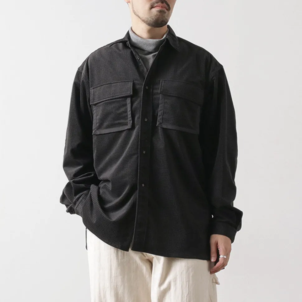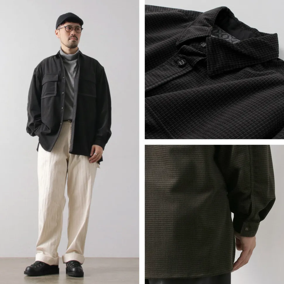 This regular-collar shirt is made of tricot fabric with a corduroy-like appearance and is full of seasonal mood.