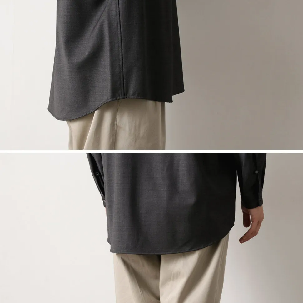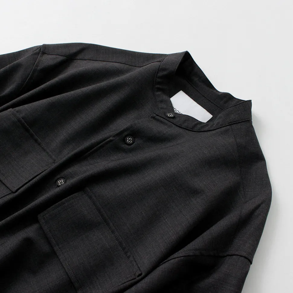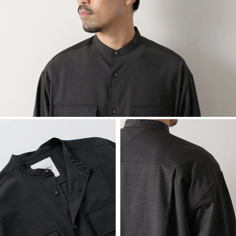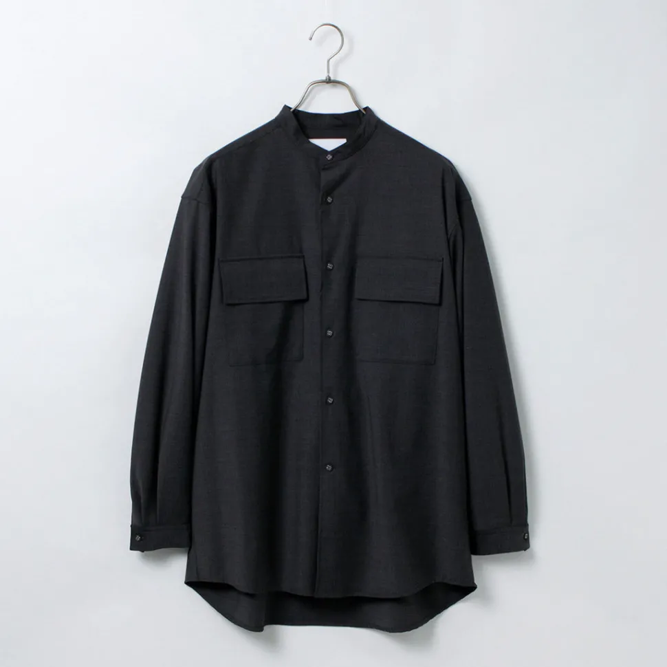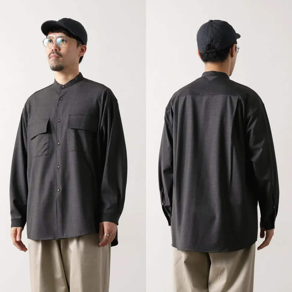 Introducing a band collar shirt with a classic silhouette from the Repose Wear series by White Mountaineering.