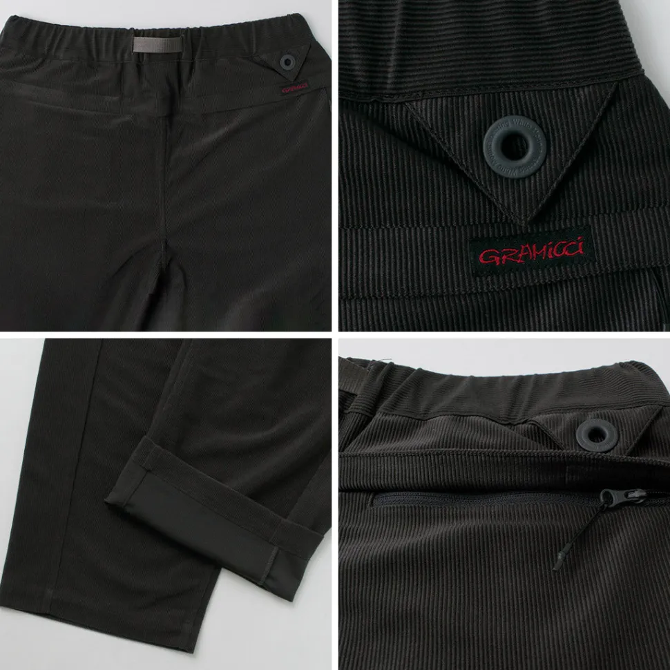 These pants replicate the look of corduroy using a vertically knitted tricot fabric. The lightweight, soft texture ensures comfort, and its breathability makes it suitable for layering in winter without causing discomfort. The fabric is wrinkle-resistant and machine washable, making it easy to care for.