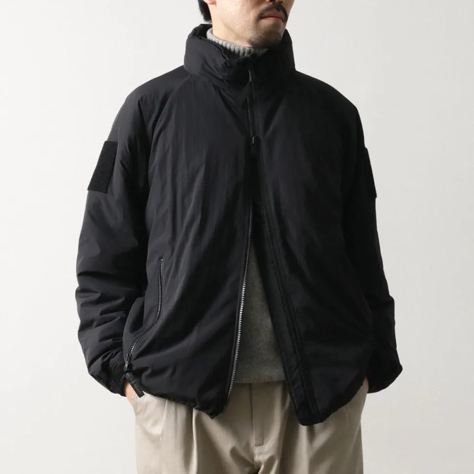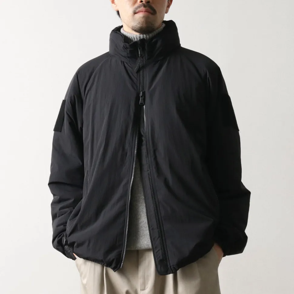 In addition to a design and size that are closer to the original ECWCS LEVEL7 HAPPY SUITS, this model has a regulated amount of padding. It uses a matte nylon fabric with a natural wrinkled texture and subdued sheen, giving it a calm, mature impression.