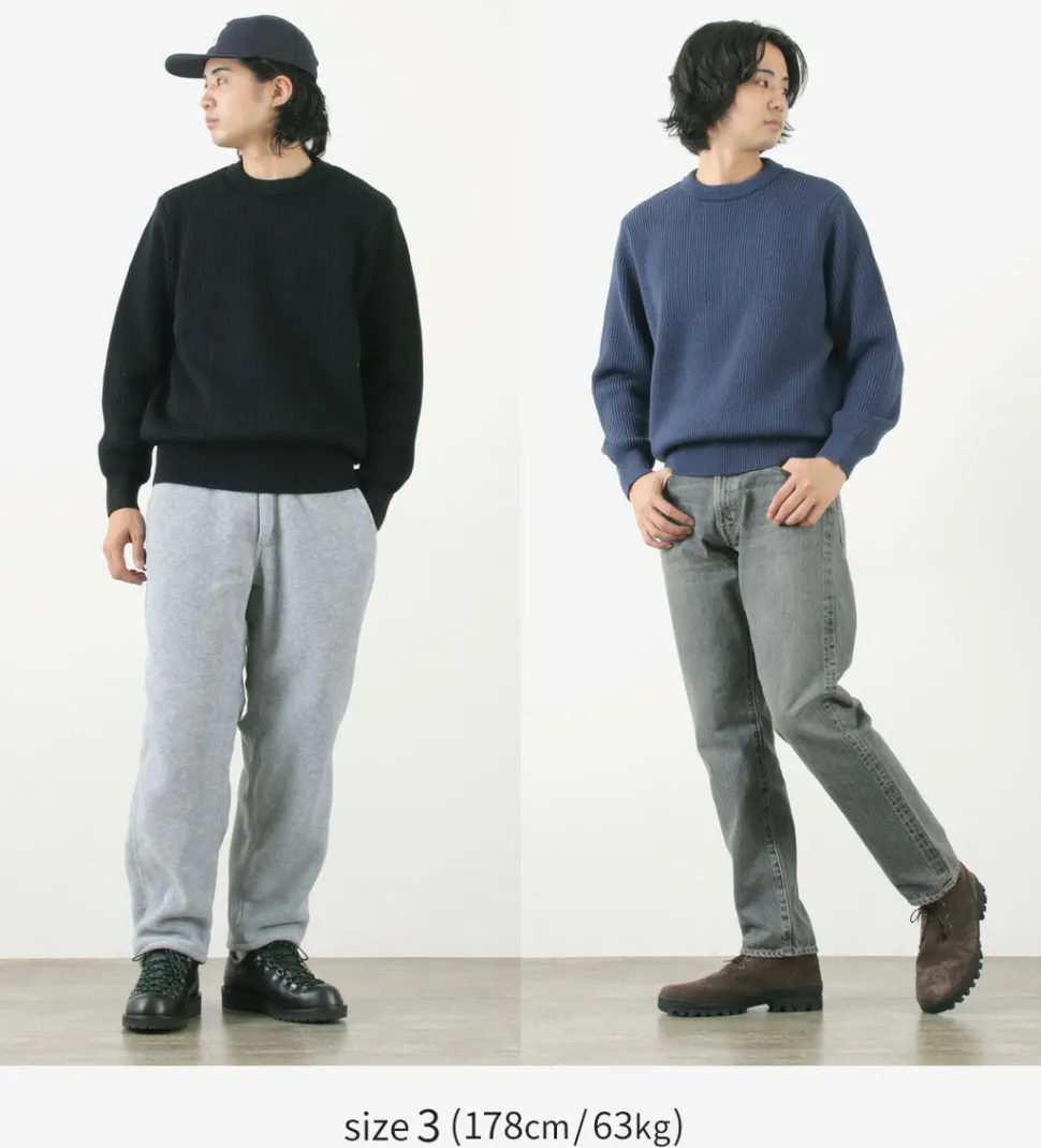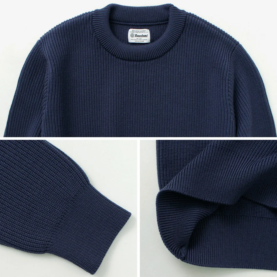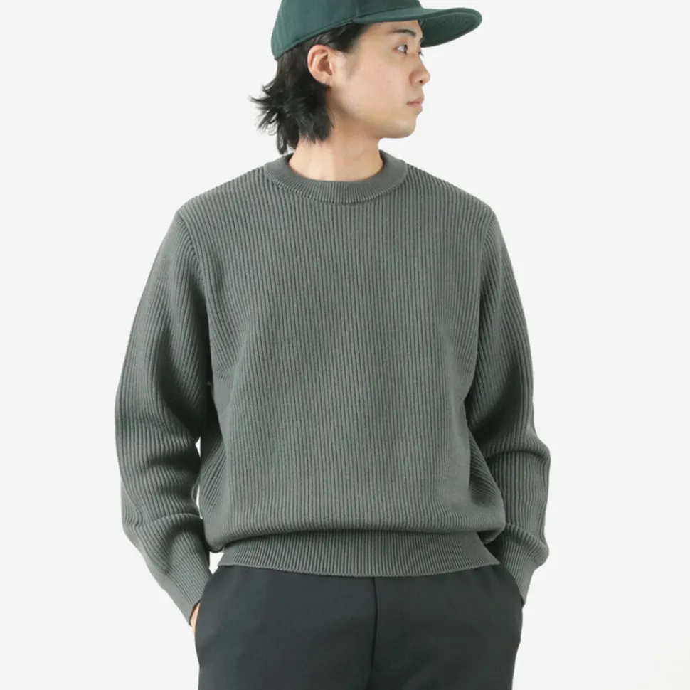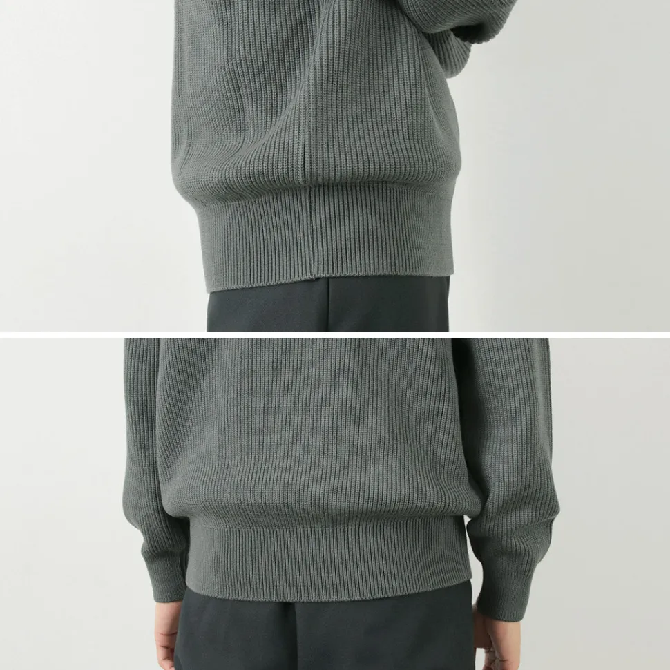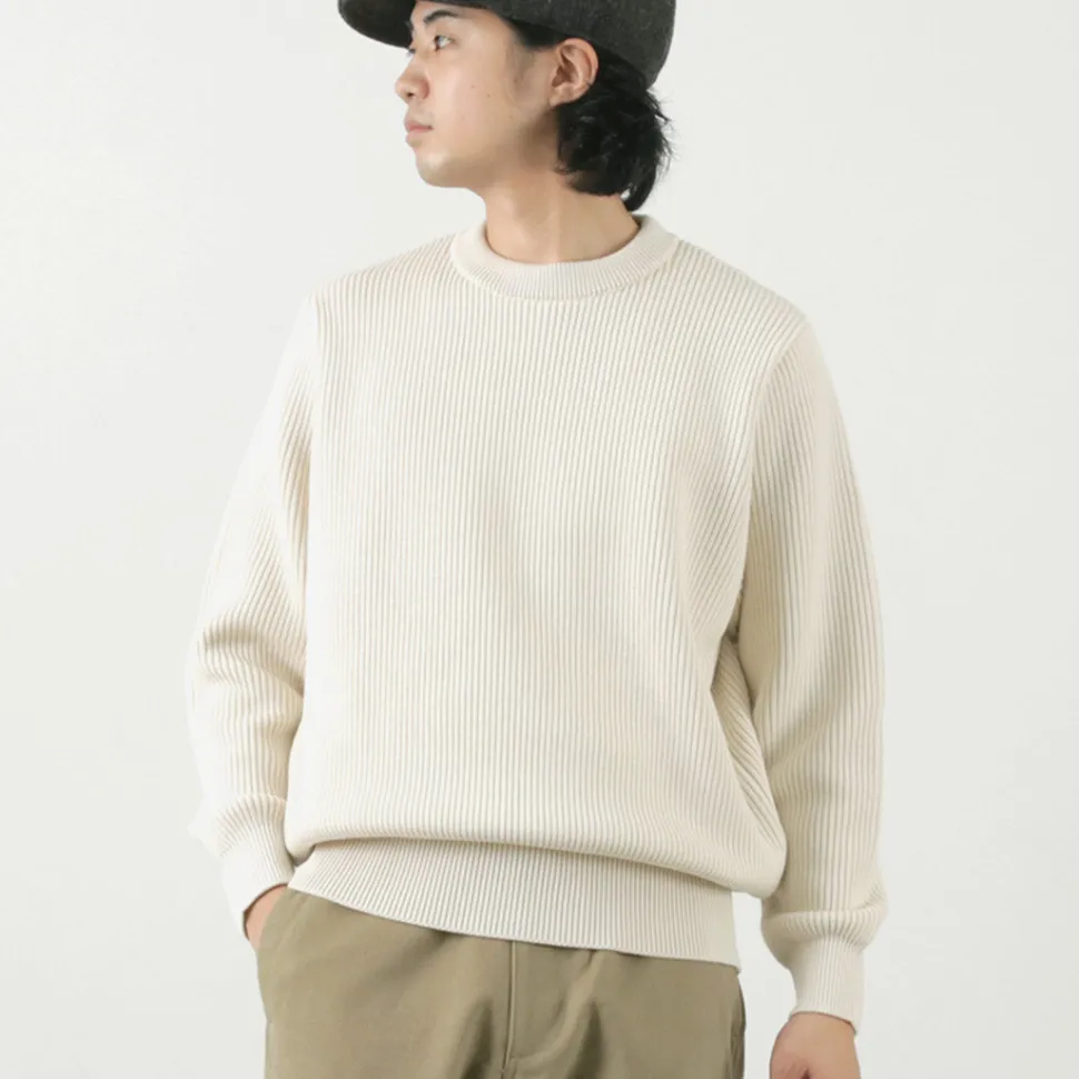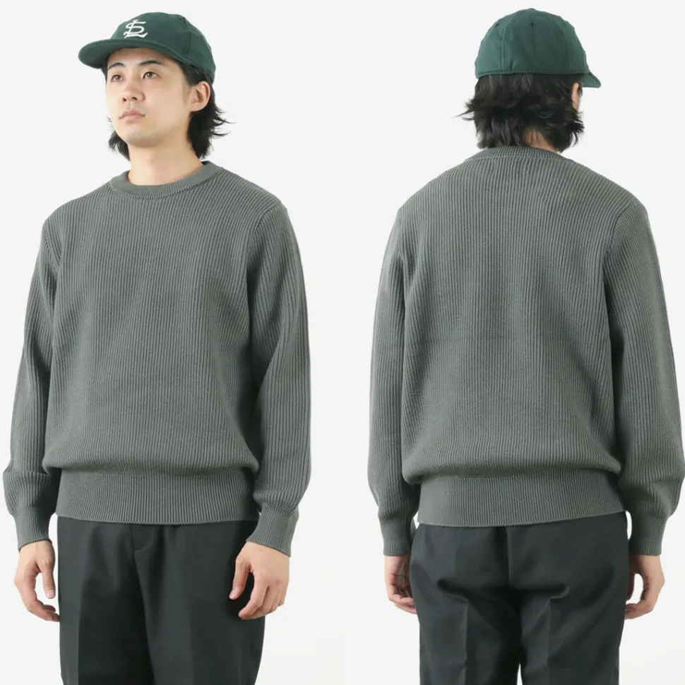 This crew-neck sweater is knitted with half cardigan knitting, using Italian wool. The simple design, with a flat appearance and no decorative techniques, makes this a basic piece suitable for a variety of occasions.
