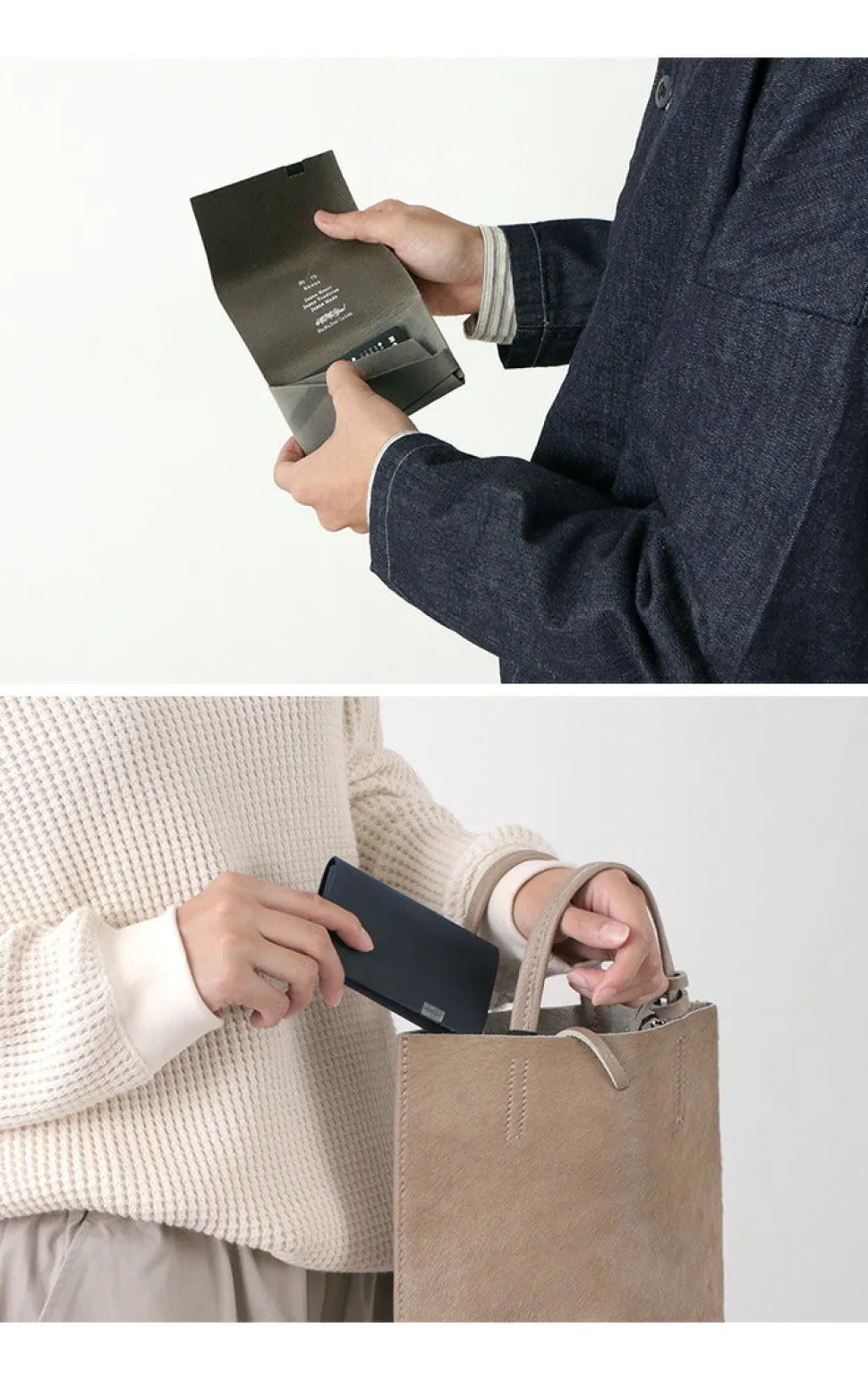 Beautiful and sophisticated leather craftingThe motif of this wallet is “fukusa,” a piece of cloth used to wrap celebrations at weddings. The design is reminiscent of the beautiful movement of a fukusa being unfolded, and the detailing of the overlapping paper in the traditional Japanese folded shape makes it a classy item for the everyday activity of spending money. This minimalist card case is made by folding a single piece of leather without sewing, and then fastening it at a single point. It makes your daily activities such as exchanging business cards and using cards look elegant. With its compact size, simple design, and soft texture that feels good in your hand, it is an item that both men and women can enjoy.