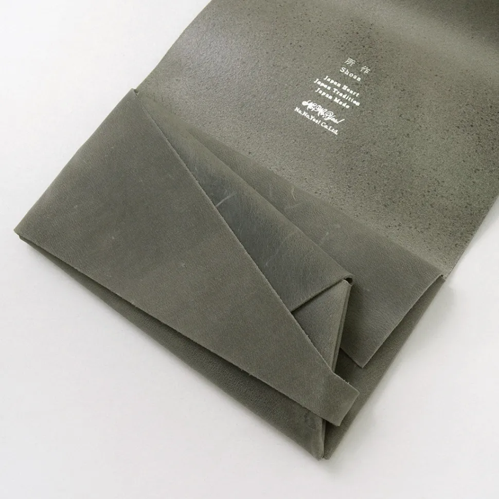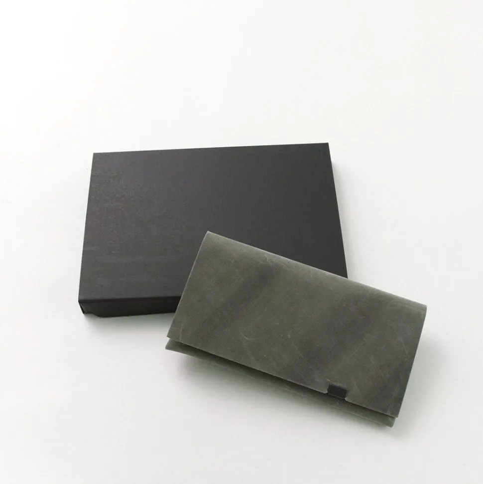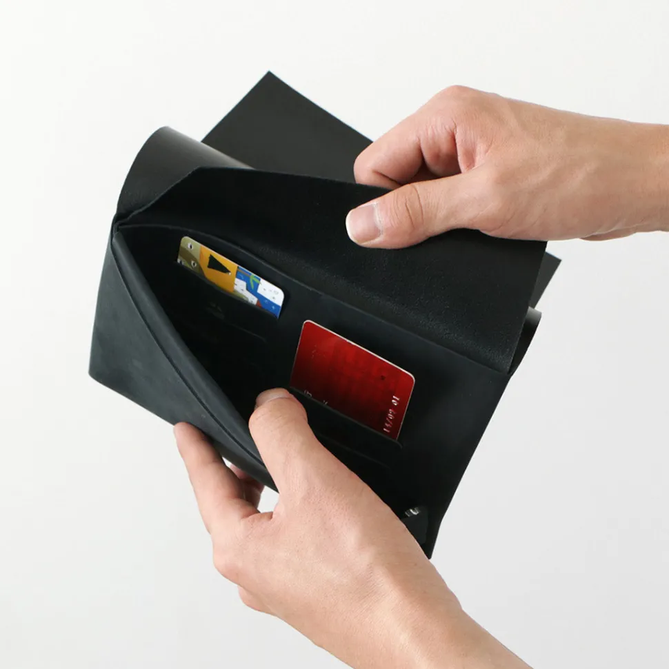 This minimalist long wallet is formed by folding a single piece of leather without sewing and fastening it at a single point.