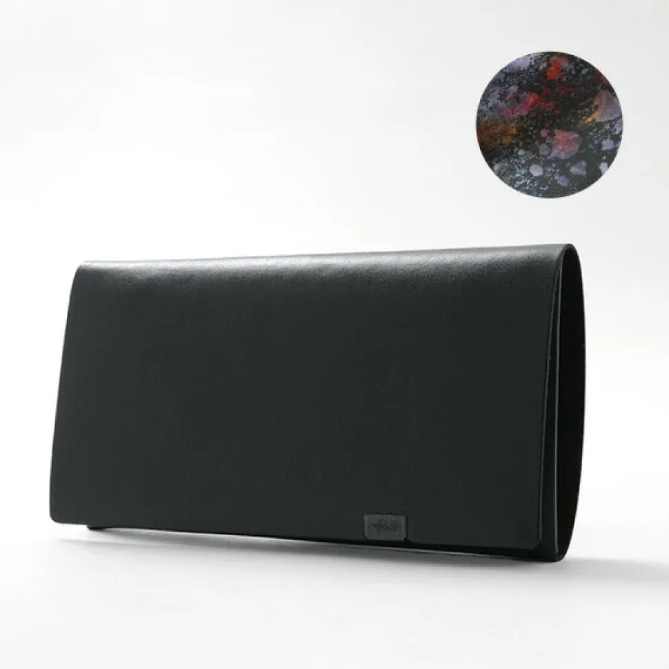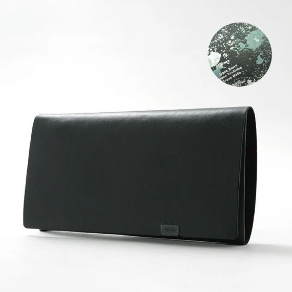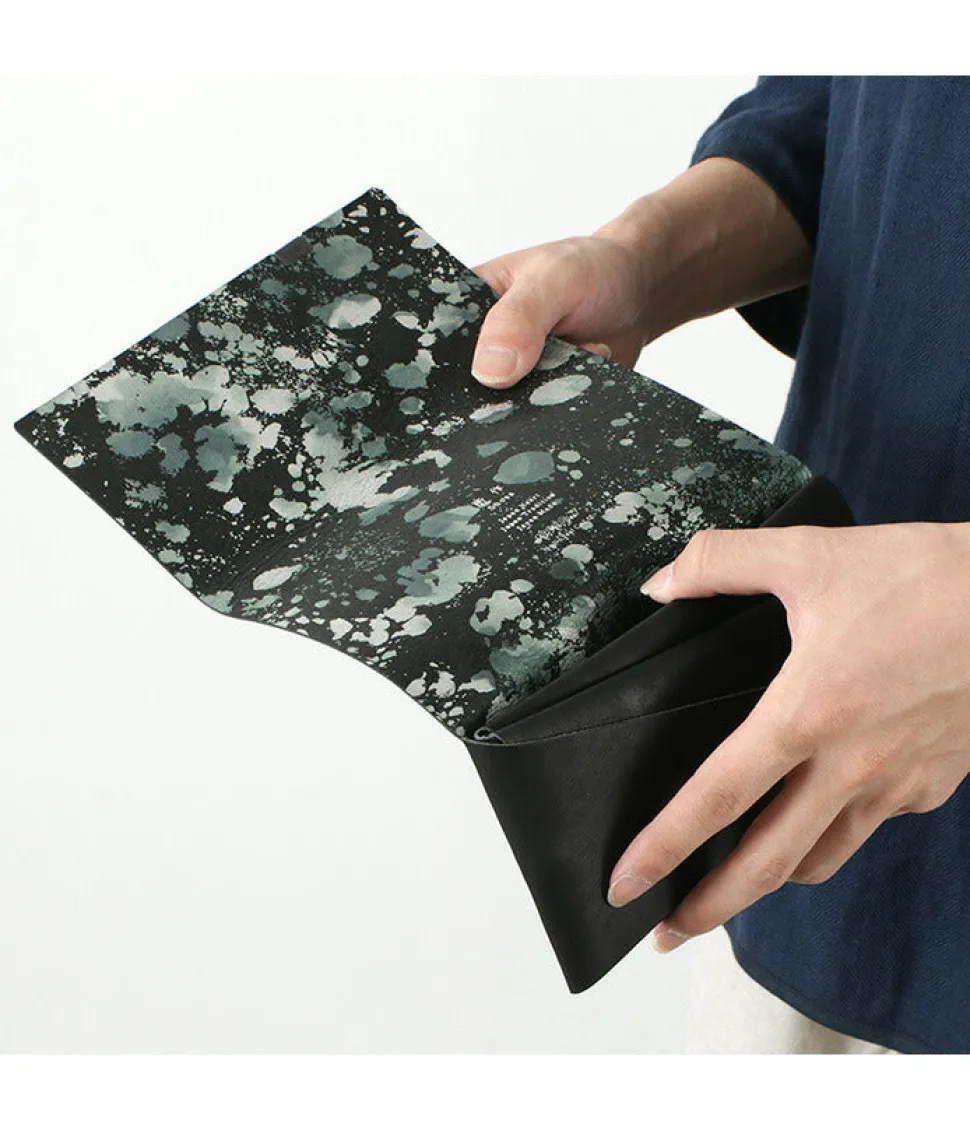 This minimalist long wallet is formed by folding a single piece of leather without sewing and fastening it at a single point. The clean appearance of the cover, which wraps around the body, and the design that reveals a foil-stamped pattern inside when it is opened are both gorgeous and elegant, and can be enjoyed by both men and women.
