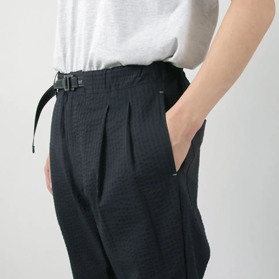 Tapered silhouette with a slightly strong gather toward the hem. With two tucks at the front, it provides room around the waist while maintaining a clean silhouette.