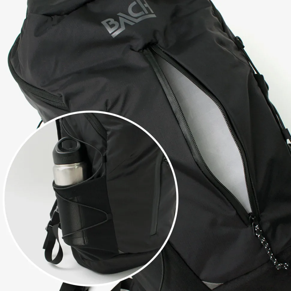 Wide, shallow front pocket with watertight zip. The mesh pockets on both sides are made of stretchable material and are convenient for storing bottles and folded umbrellas.