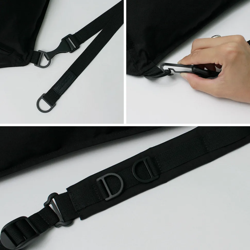 The shoulder strap also features two D-rings for attaching accessories like carabiners, making it easy to carry items such as keys or earphones.