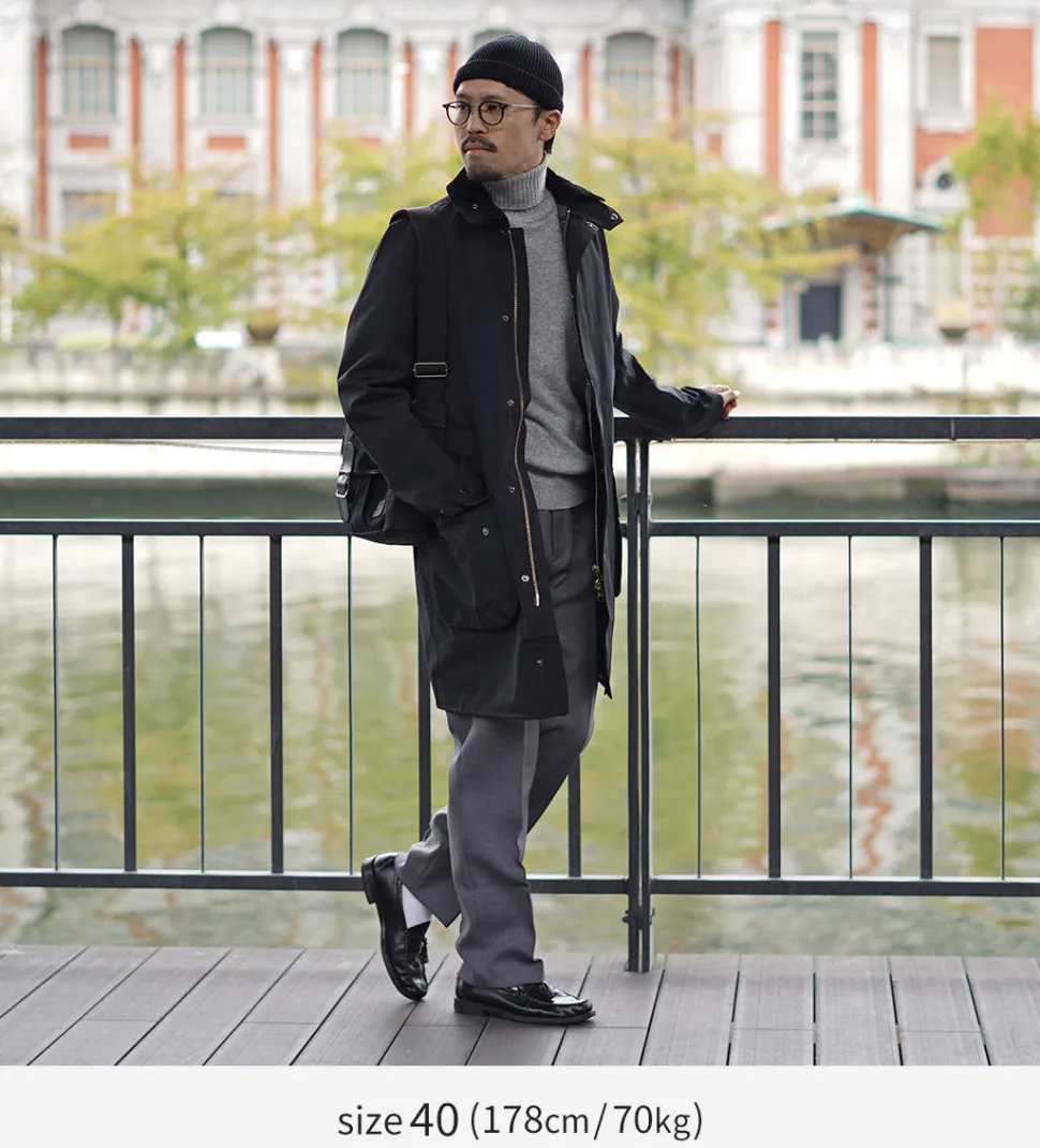 A special film is applied to the reverse side of the cotton-based fabric to ensure water resistance. This item can be worn with peace of mind even by those who do not like wax jackets.