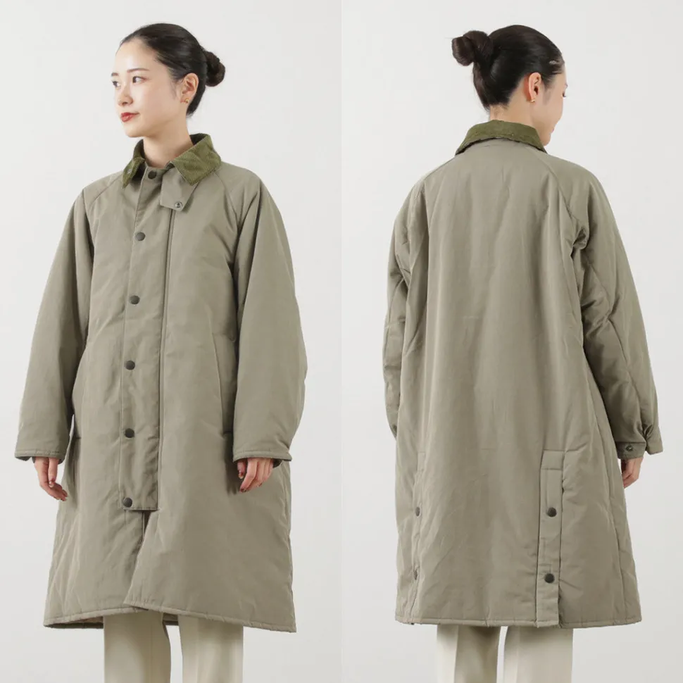 This mid-length coat is a knee-length version of the Barbour’s signature classic model, the “Burghley”. The luxurious appearance of the grosgrain fabric with a glossy sheen, and the inclusion of padding with excellent heat retention properties, make this a perfect piece for full-fledged winter wear.
